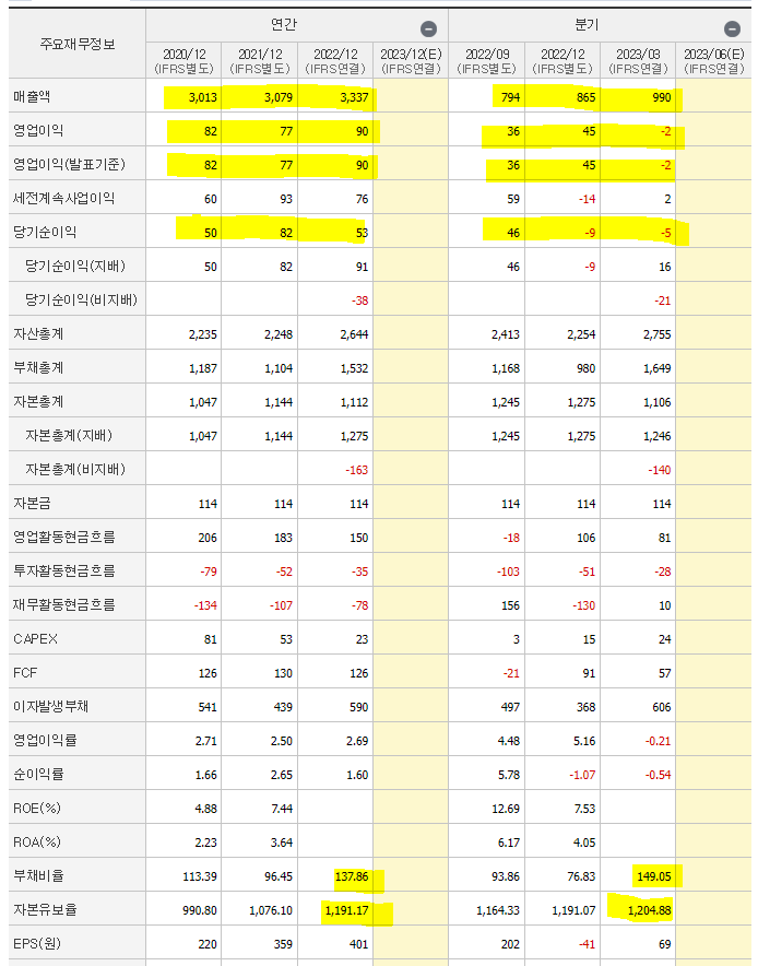 다만 아래 제무제표에 나온 올해 23년1분기의 실적은 이익이 좋지 않네요.