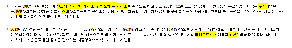 반도체 검사장비, 부품 제조 업체. 반도체 구성재료인 리드프레임 후 공정가공 및 최종 검사 사업(LOC사업), PCB사업, 반도체 관련장비 사업(LOC, PCB 검사장비) 등을 영위. 주요 매출처로 삼성전기, LG이노텍 등.