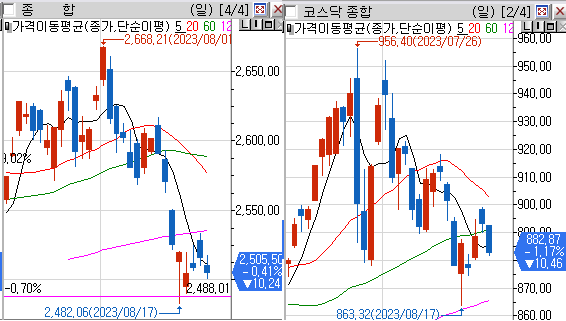 코스피 전일대비 하락(음봉) 마감,코스닥 전일대비 상승(음봉) 마감