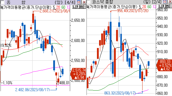 코스피 전일대비 상승(음봉) 마감,코스닥 전일대비 상승(음봉) 마감