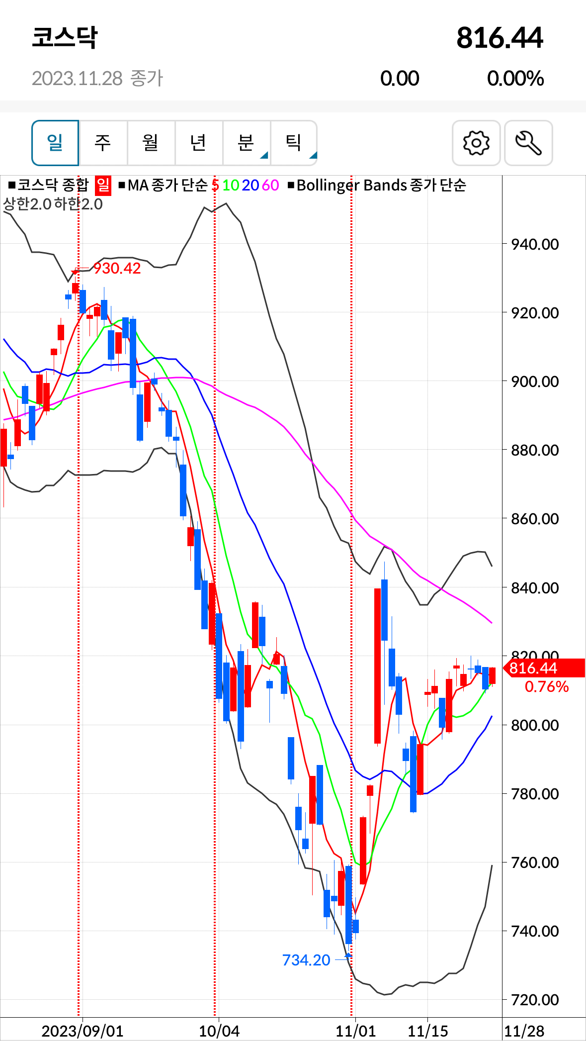 * 코스닥 전일대비 상승(양봉) 마감