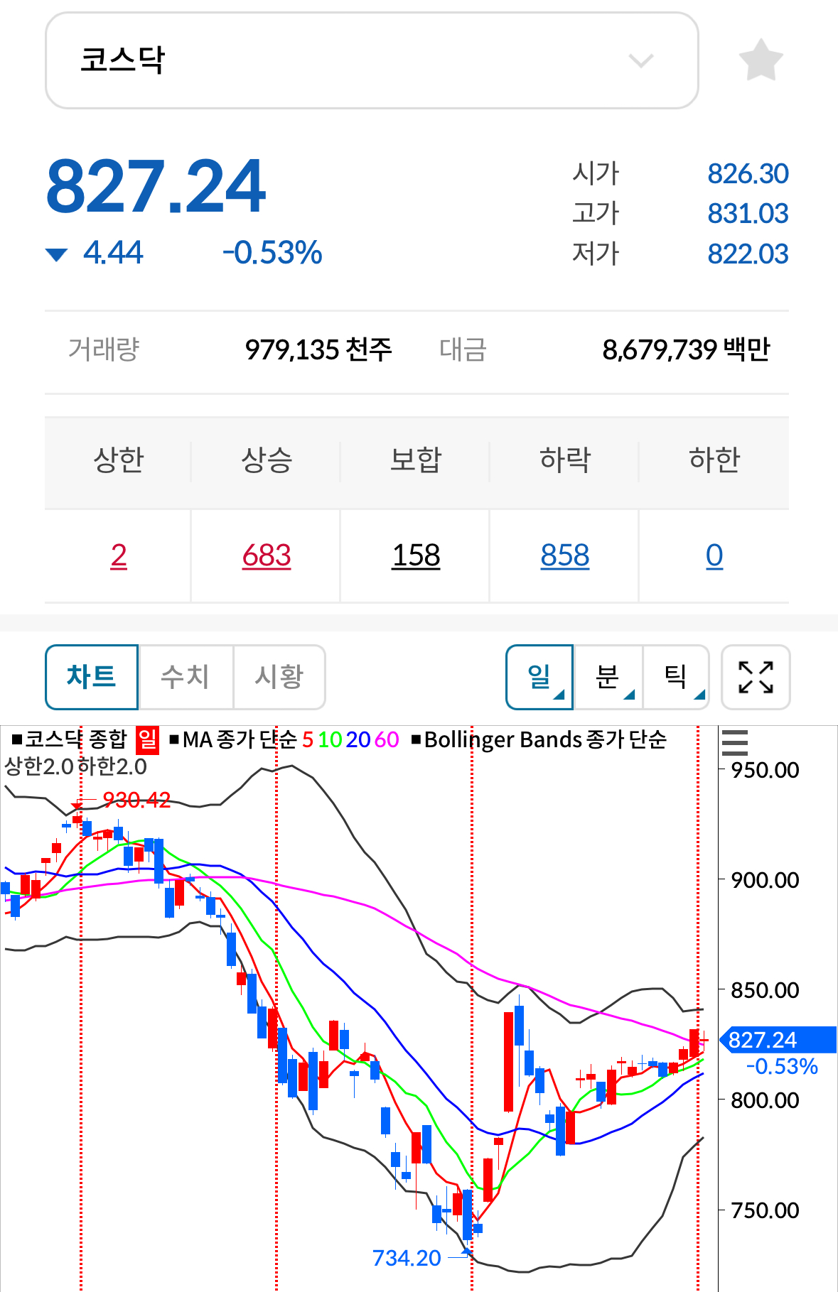 * 코스닥 전일대비 하락(음봉) 마감