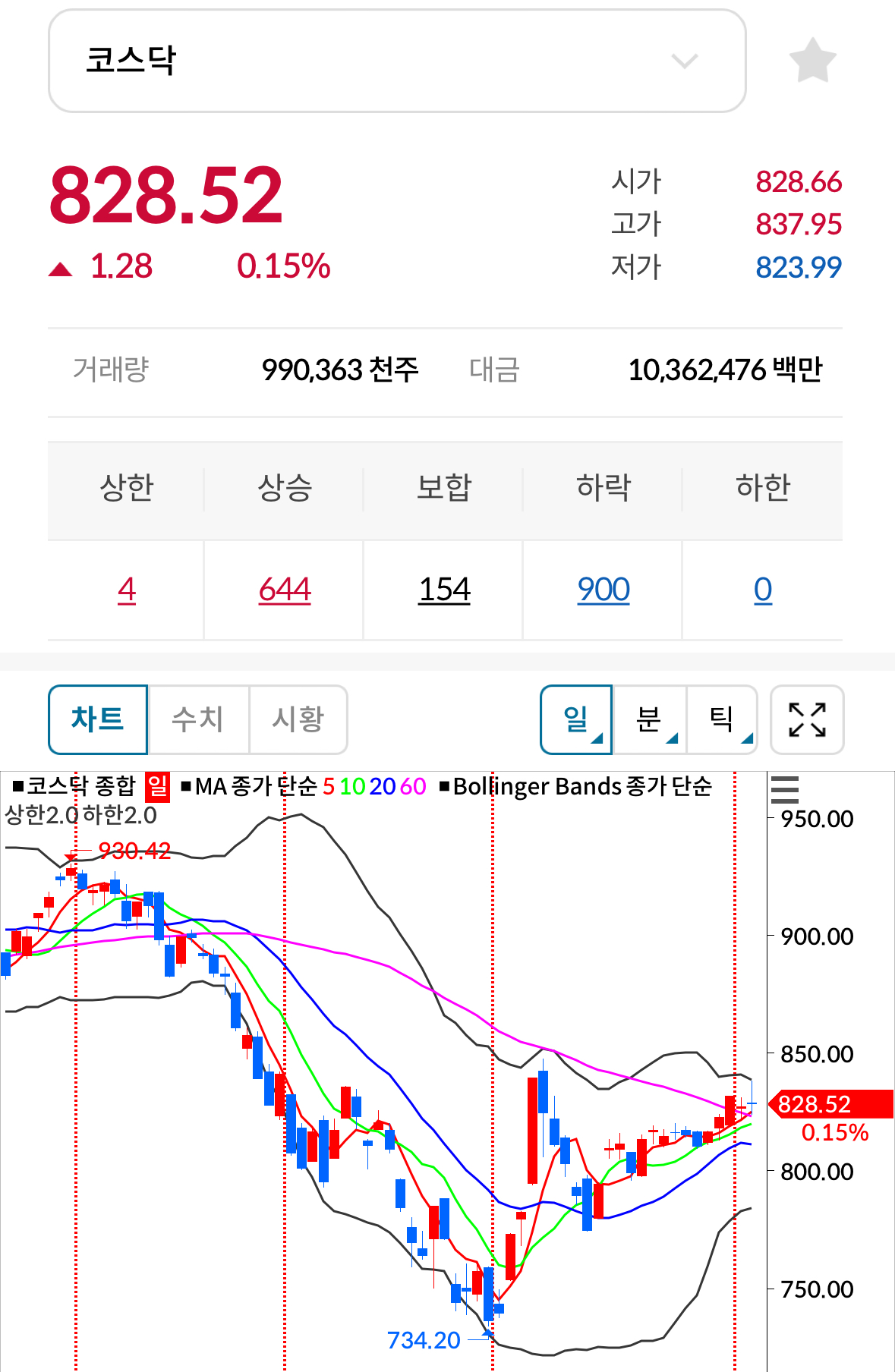 * 코스닥 전일대비 보합(양봉) 마감