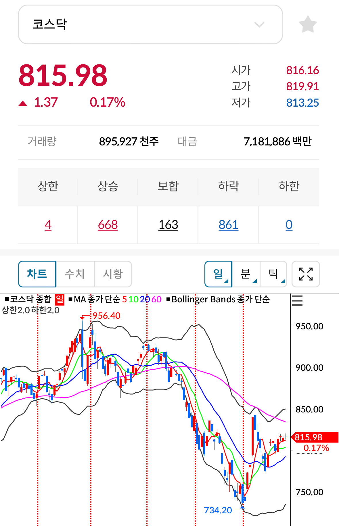 * 코스닥 전일대비 상승(양봉) 마감