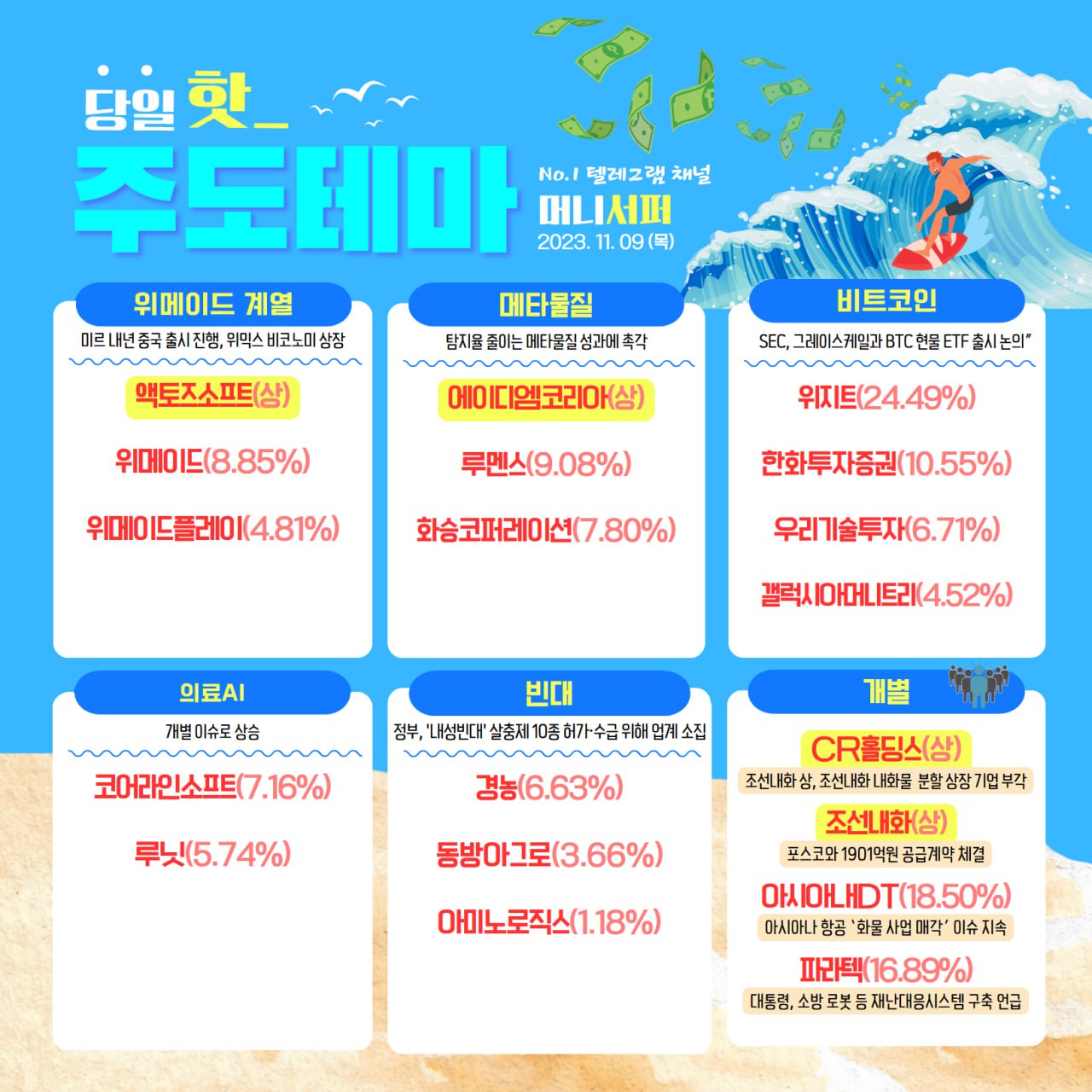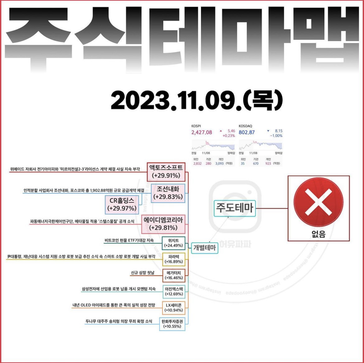 | 한국증시 주도 테마★ 게임 광대역스텔스물질 자율주행 ★ 액토즈소프트 위메이드플레이 컴투스홀딩스 위메이드 위메이드맥스 화승코퍼레이션 화승알앤에이 에이디엠코리아 이노시뮬레이.. (9) | 2023.11.08 |