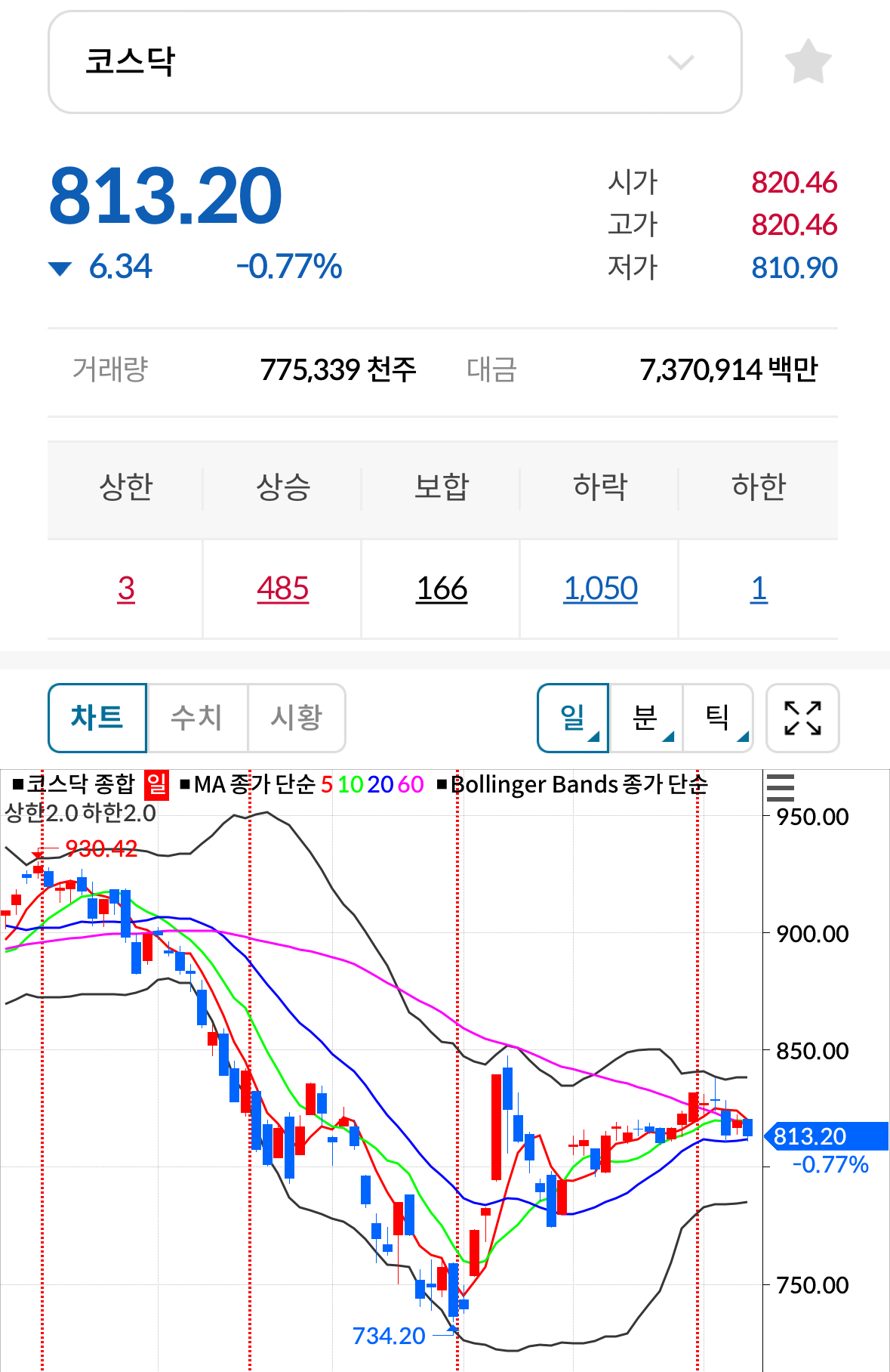 * 코스닥 전일대비 하락(음봉) 마감