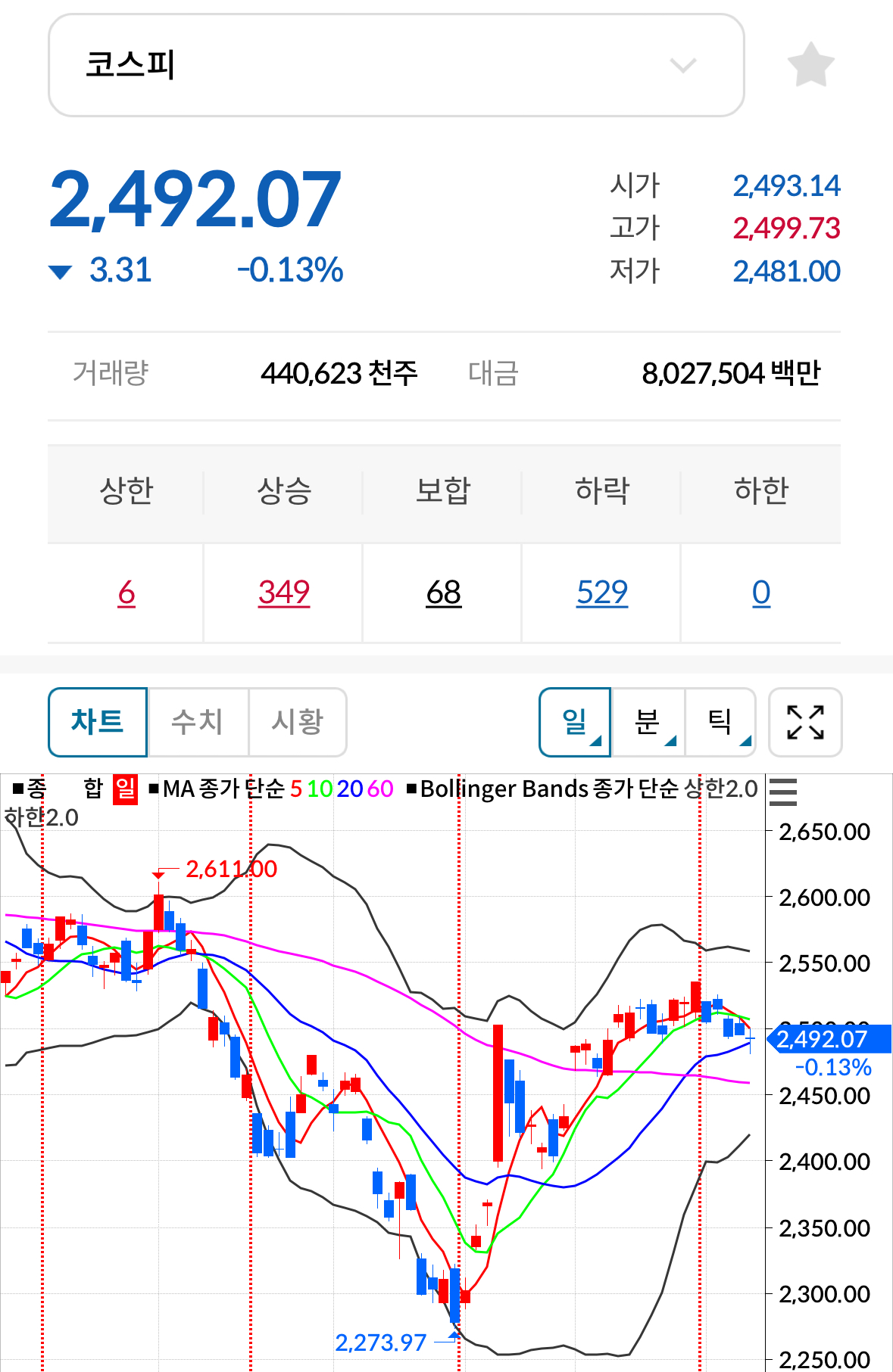 * 코스피 전일대비 하락(음봉) 마감