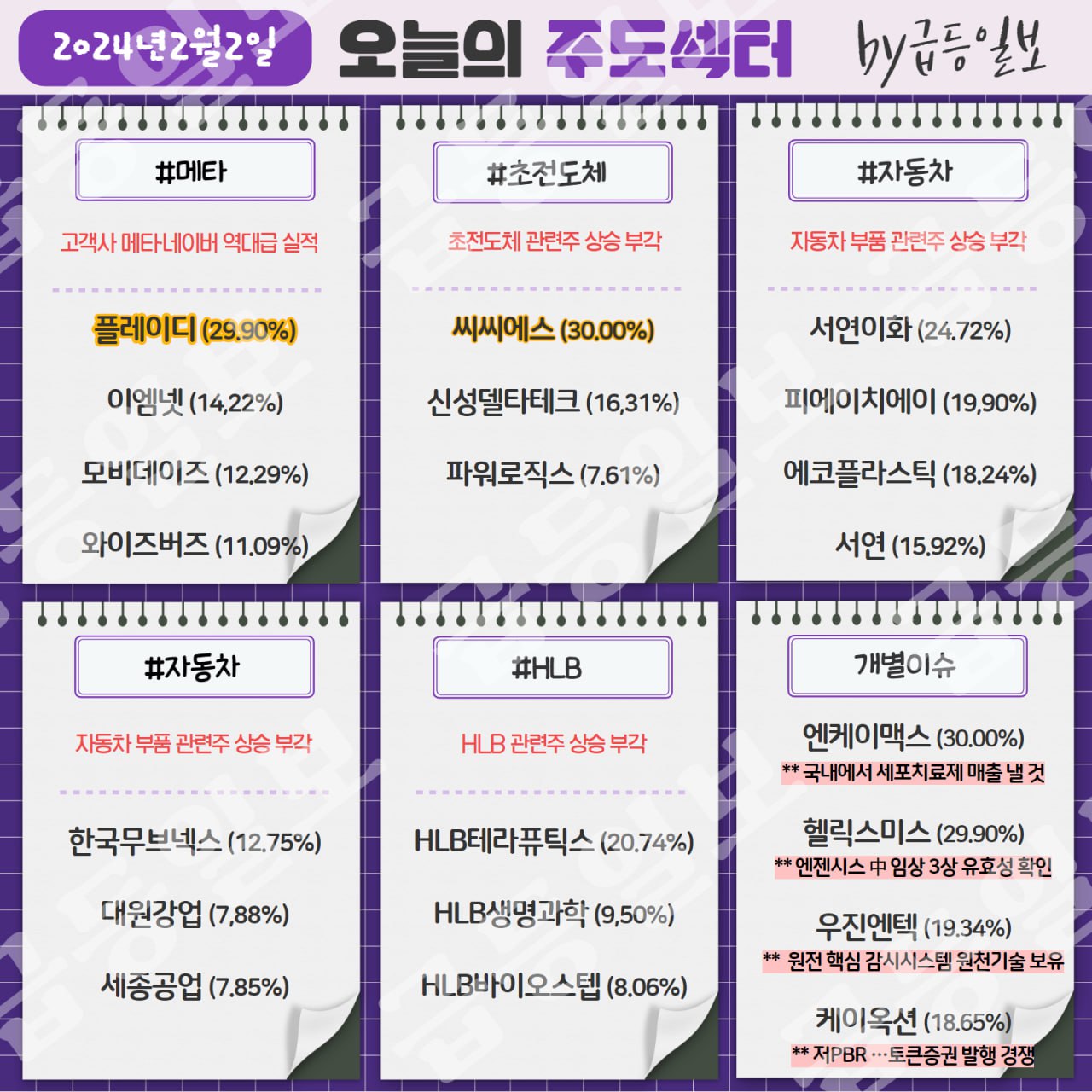 | 한국증시 주도 테마 ★ 초전도체 자동차부품 신규상장 ★ 씨씨에스 신성에스티 화승알앤에이 현대힘스 (32) | 2024.02.05 |