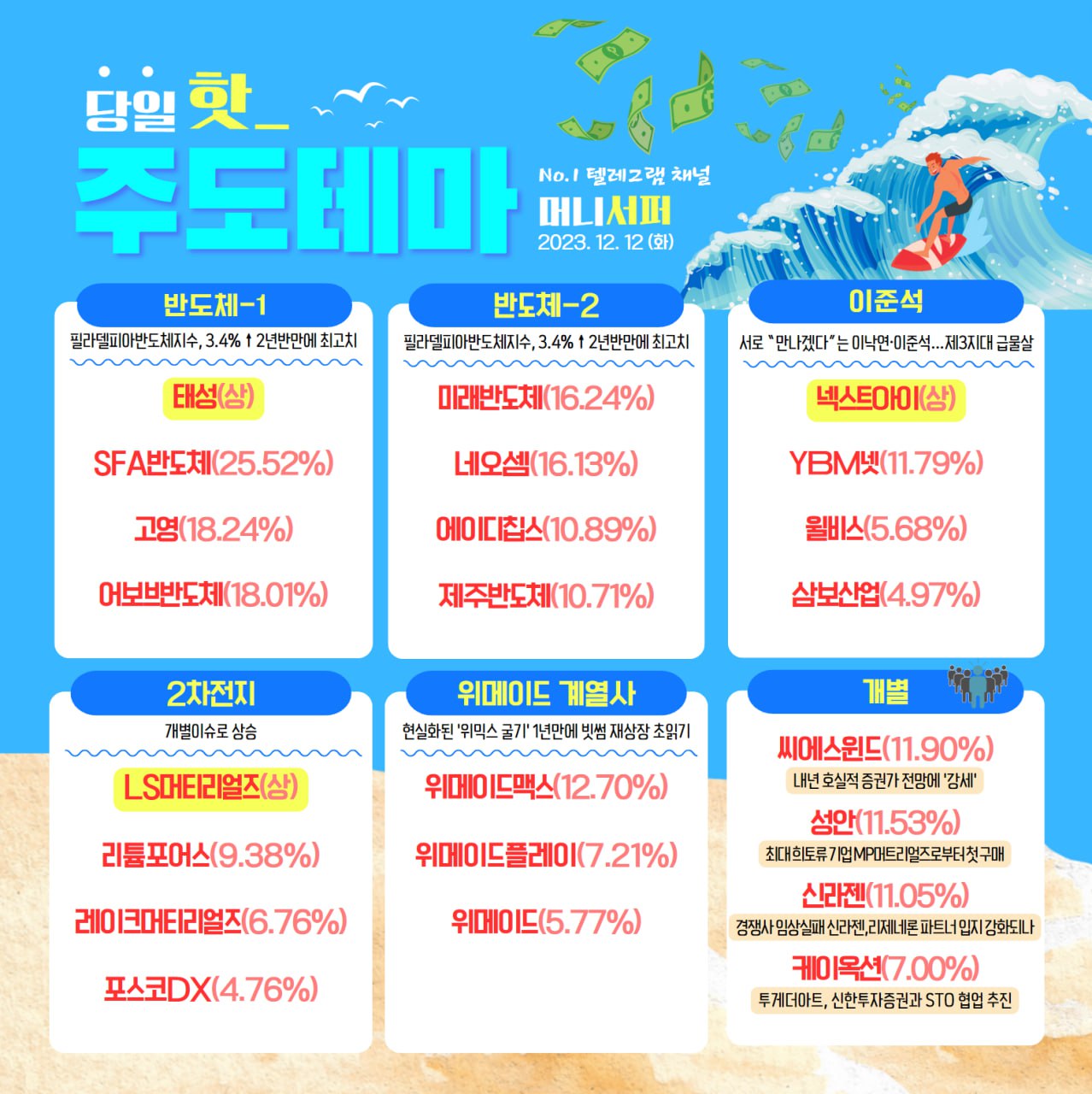 ★한국증시 주도 테마 2023년 12월 11일★ 양자컴퓨터 한동훈 이낙연 이정재 로봇 엑스게이트 덕성우 남선알미우 와이더플래닛 위지윅스튜디오 써티프라퍼티 티엔터테인먼트 LIG넥스원 * 코스피