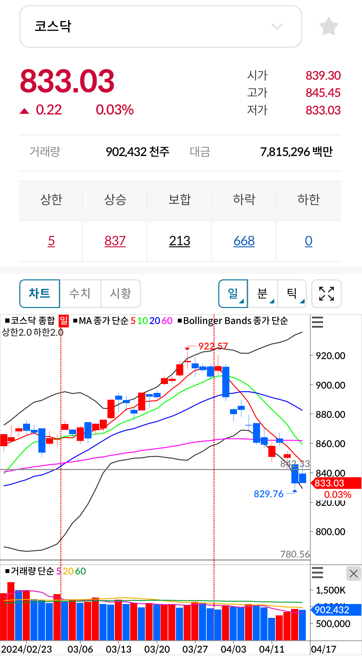 * 코스닥 전일대비 상승(음봉) 마감