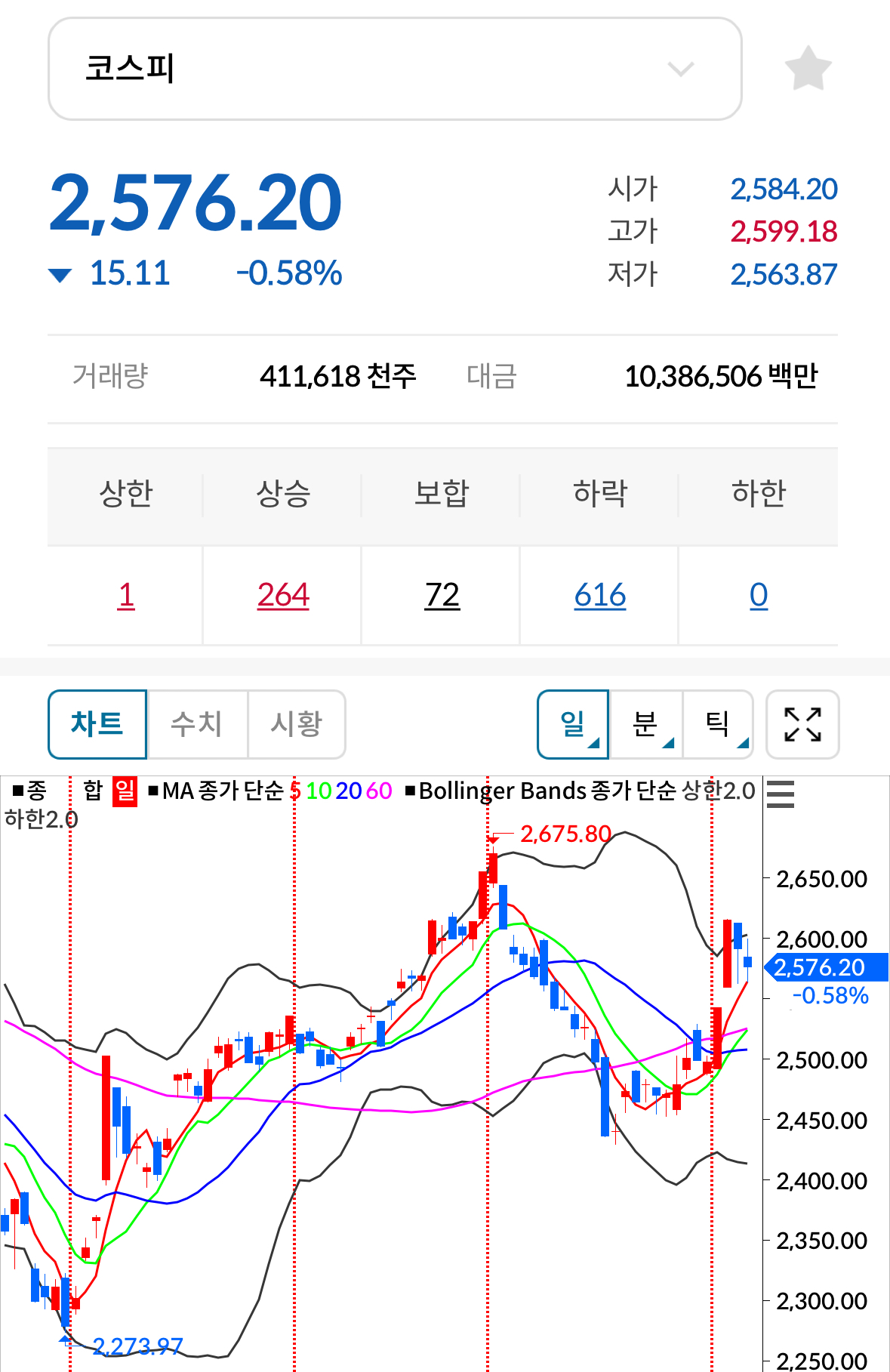 * 코스피 전일대비 하락(음봉) 마감