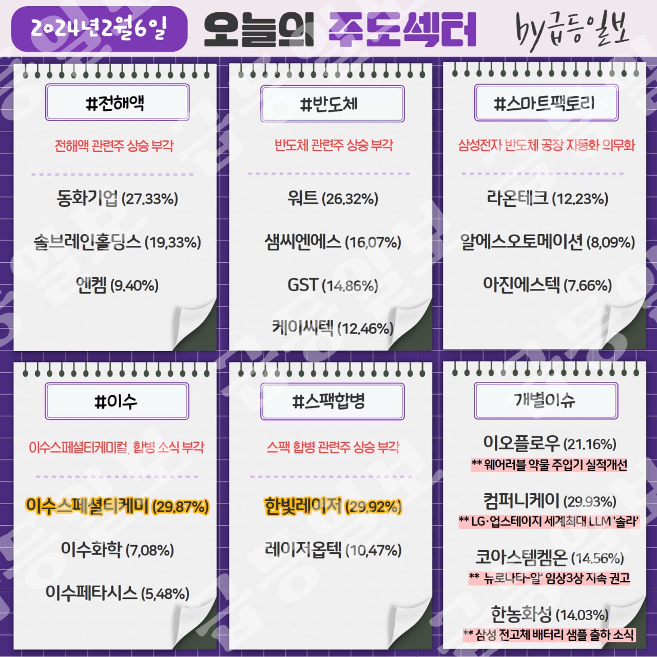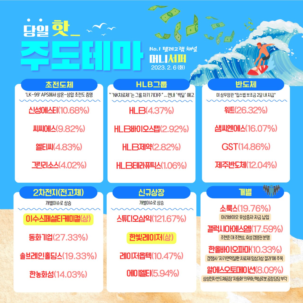 ★한국증시 주도 테마 2024년 2월 5일★ 초전도체 자동차부품 신규상장 씨씨에스 신성에스티 화승알앤에이 현대힘스* 코스피 전일대비 하락(음봉) 마감 * 코스닥 전일대비 하락(음봉) 마감 전일