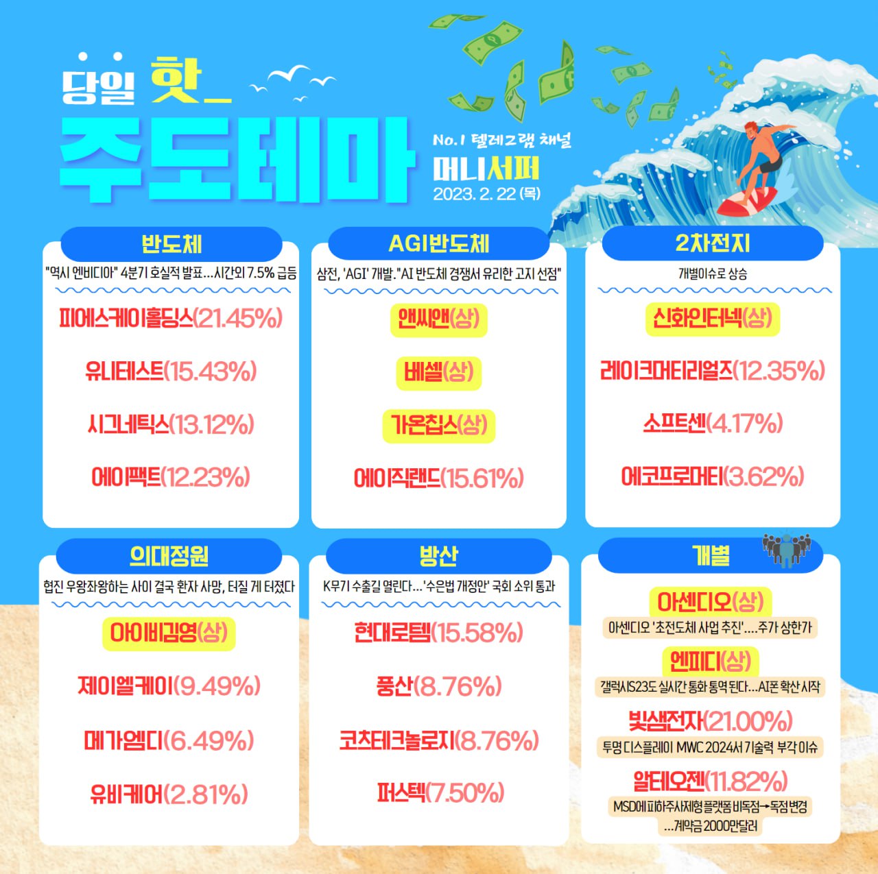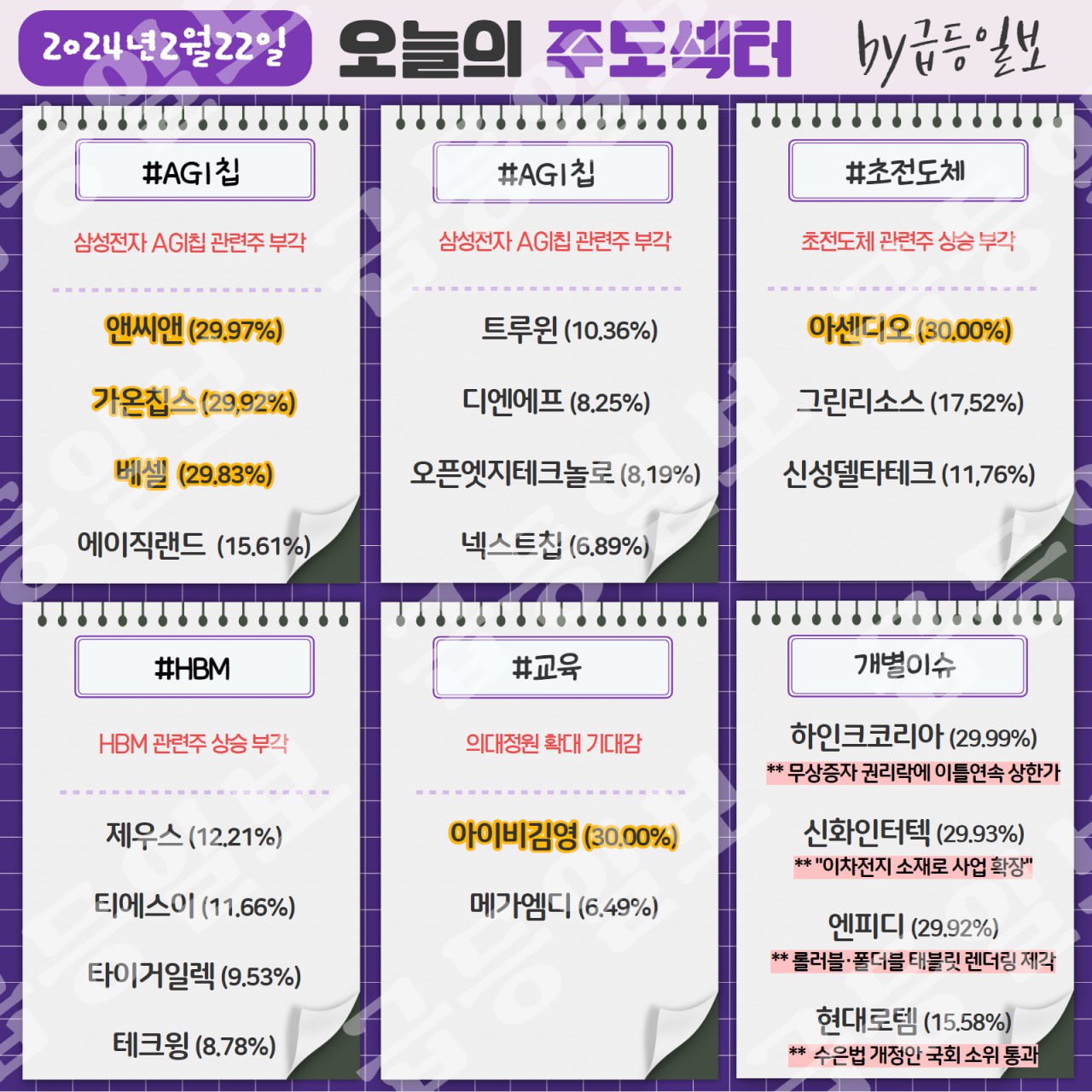 | 한국증시 주도 테마 ★ 2차전지 교육 AI 초전도체 웹툰 ★ 솔브레인홀딩스 덕산테코피아 비상교육 아이비김영 키네마스터 신성델타테크 서남 와이랩 (23) | 2024.02.20 |