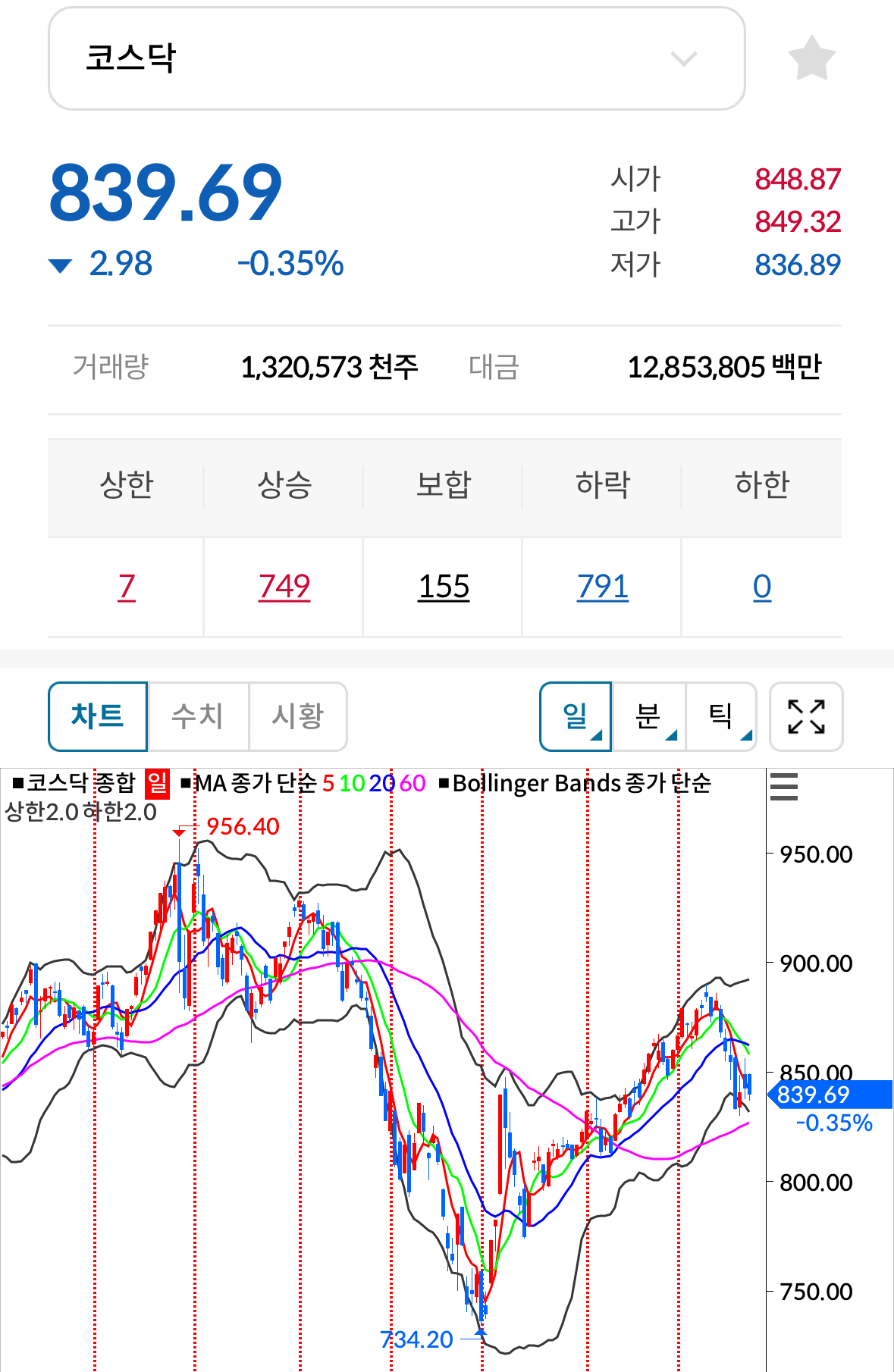 * 코스닥 전일대비 하락(음봉) 마감