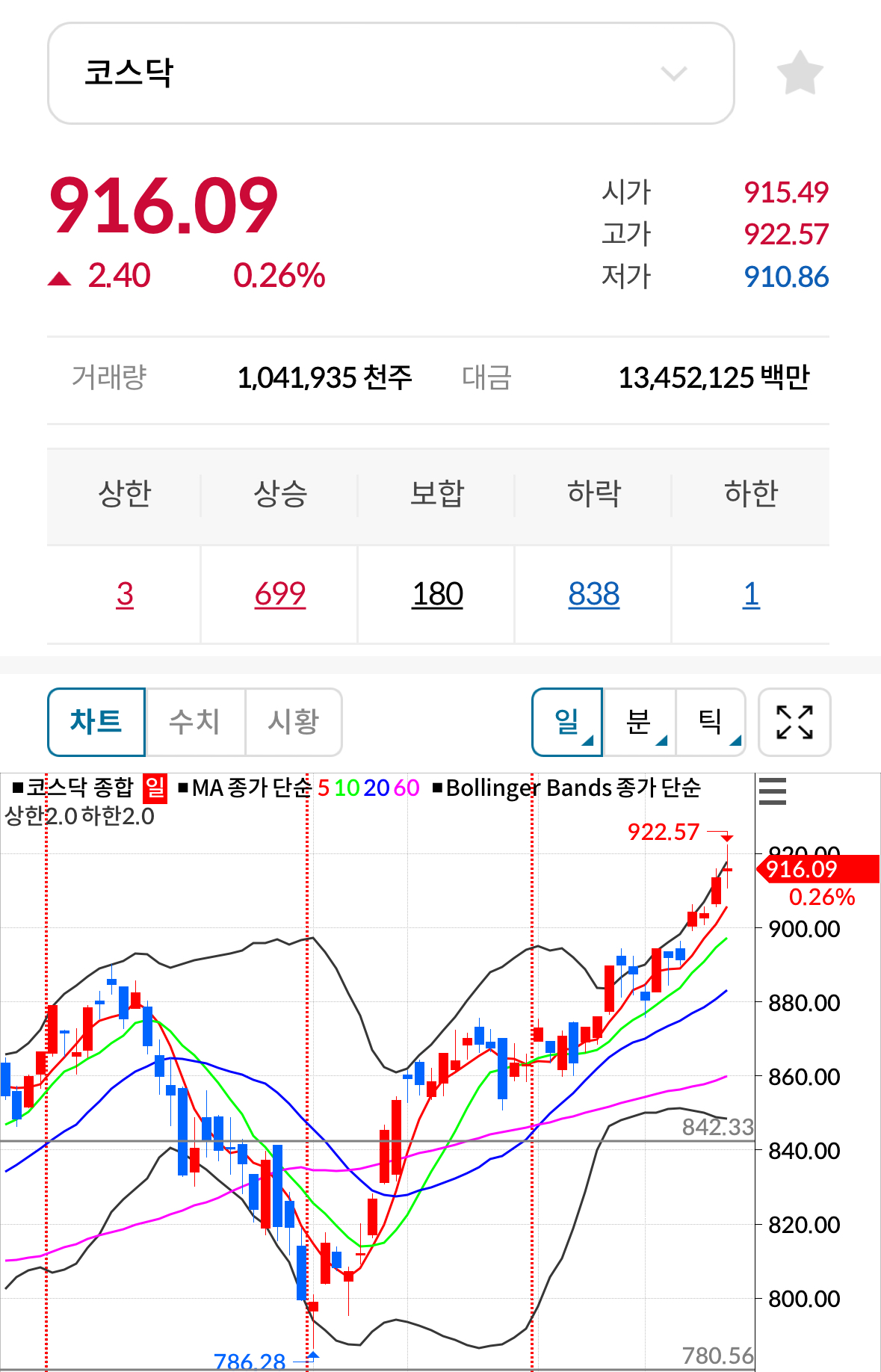* 코스닥 전일대비 상승(양봉) 마감