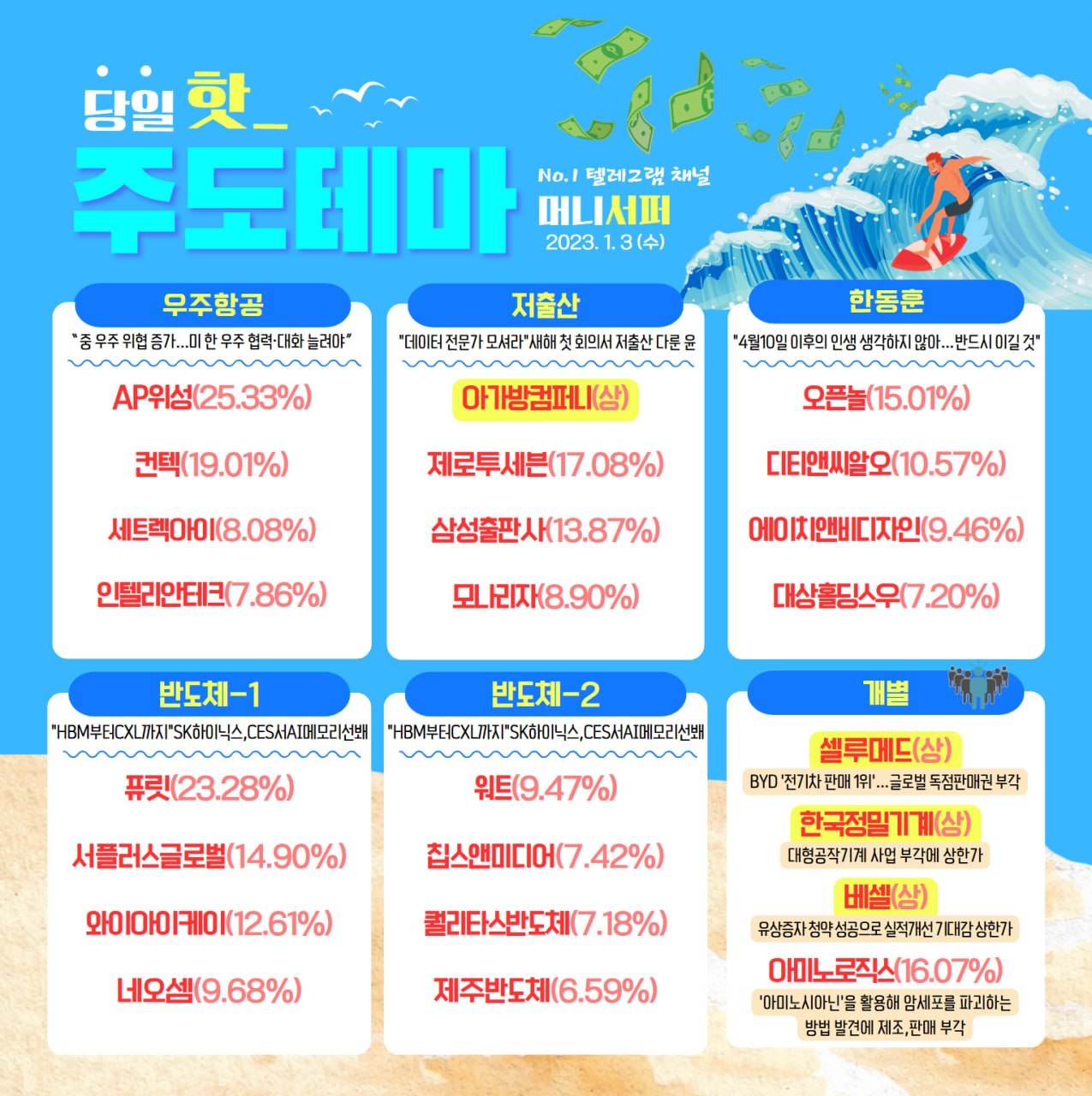 한국증시 주도 테마 ★ 우주항공 저출산 태영건설 반도체 ★ AP위성 컨텍 아가방컴퍼니 제로투세븐 태영건설우 티와이홀딩스우 퓨릿