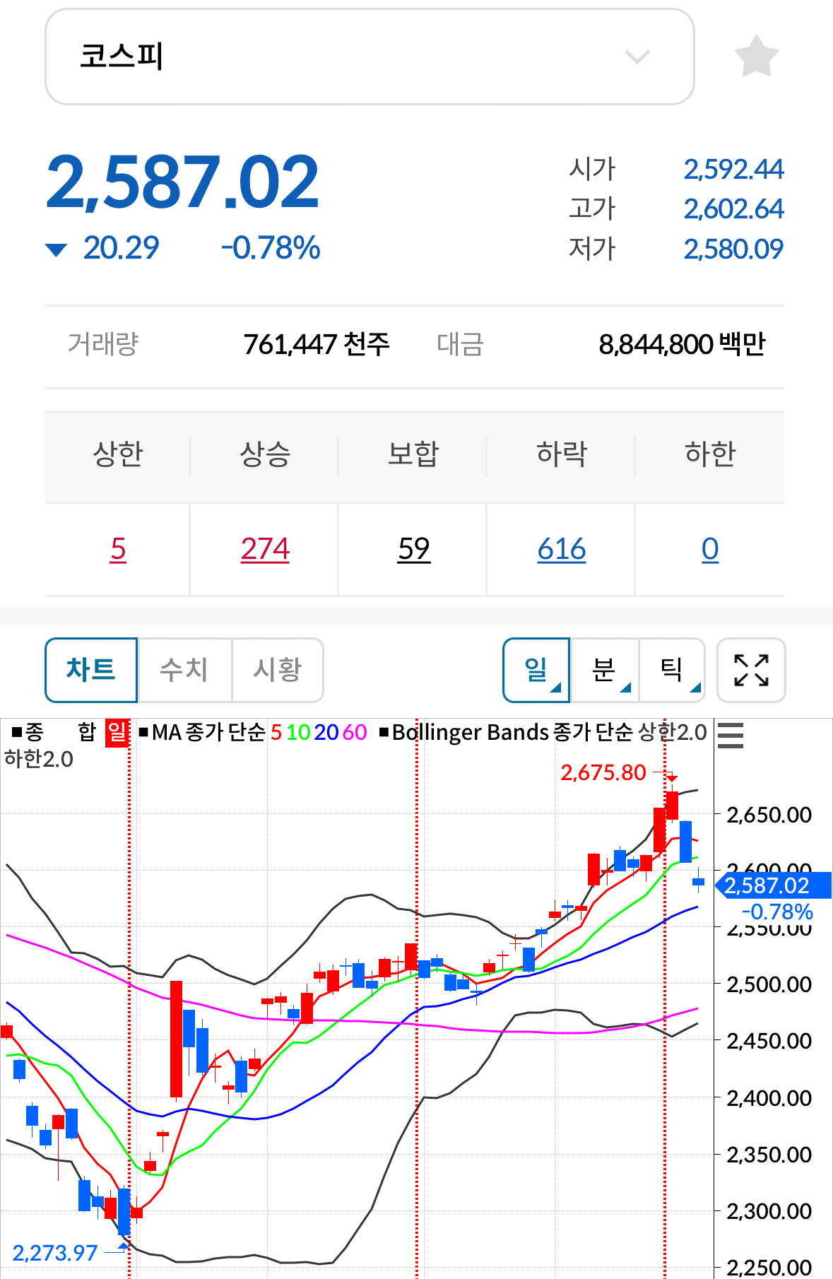 * 코스피 전일대비 하락(음봉) 마감