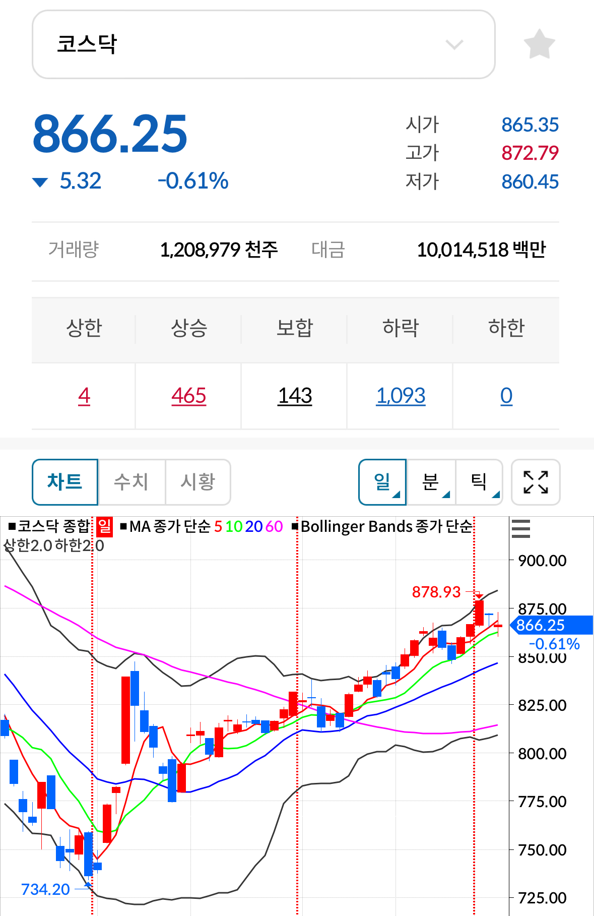 * 코스닥 전일대비 하락(양봉) 마감