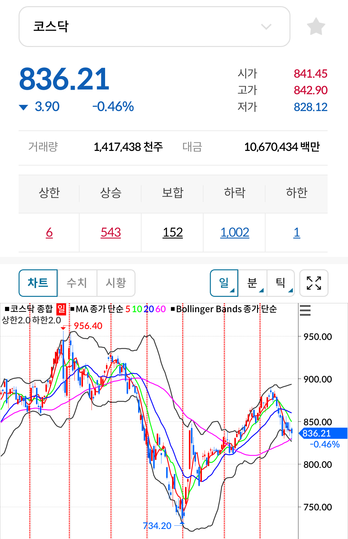 * 코스닥 전일대비 하락(음봉) 마감
