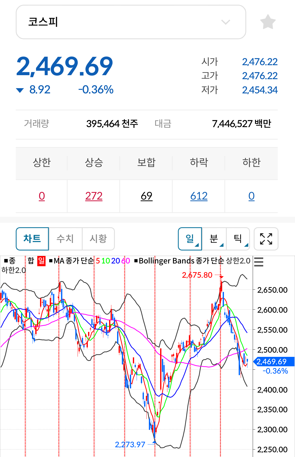 * 코스피 전일대비 하락(음봉) 마감