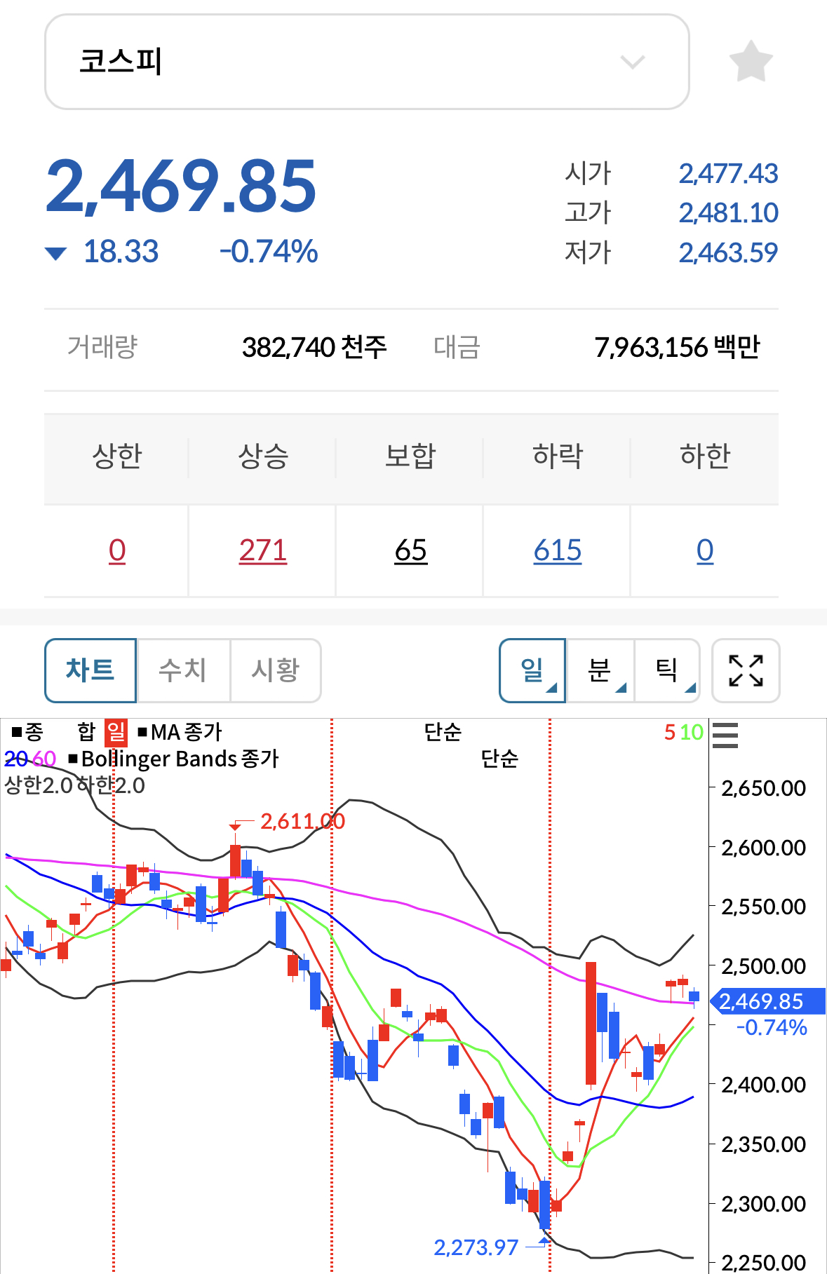 * 코스피 전일대비 하락(음봉)