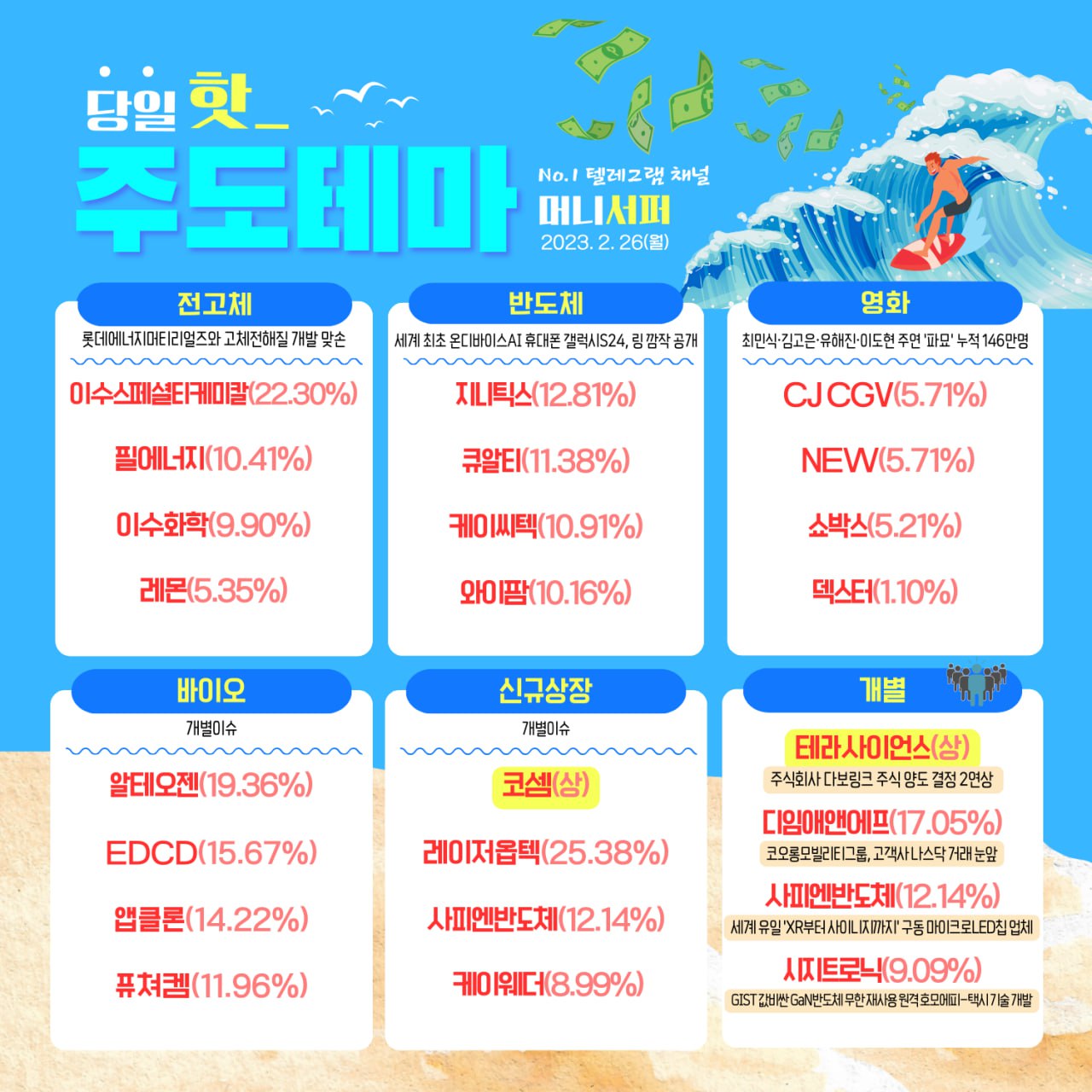 ★한국증시 주도 테마 2024년 2월 23일★ 뉴모로픽 앤씨앤 에이직랜드 초전도체 아센디오 다보링크 테라사이언스 2차전지 지오릿에너지 바이오 EDGC 알테오젠 * 코스피 전일대비 상승(음봉) 마감 *