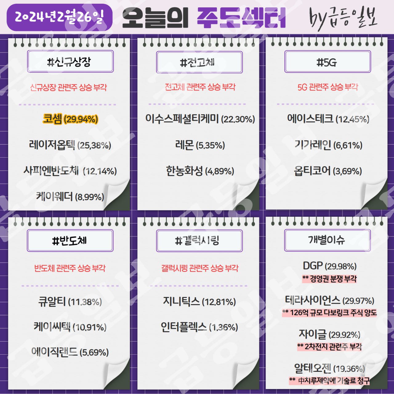 ★한국증시 주도 테마 2024년 2월 23일★ 뉴모로픽 앤씨앤 에이직랜드 초전도체 아센디오 다보링크 테라사이언스 2차전지 지오릿에너지 바이오 EDGC 알테오젠 * 코스피 전일대비 상승(음봉) 마감 *