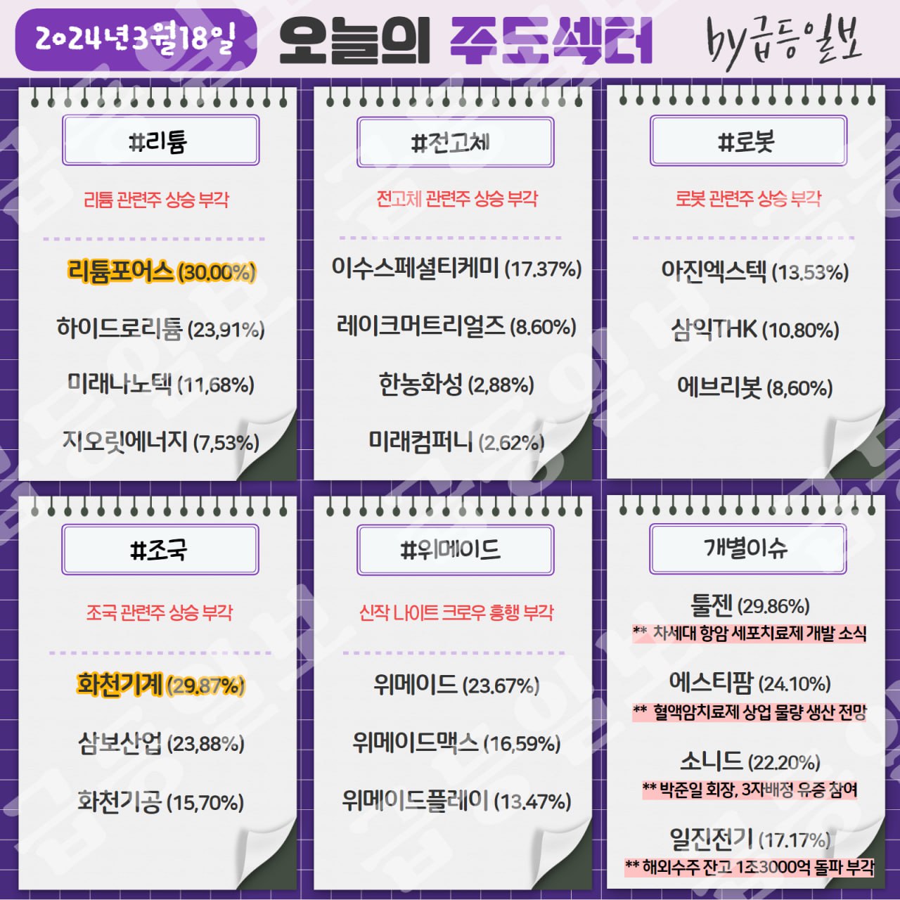 | 한국증시 주도 테마 ★ 2차전지 초전도체 로봇 에이프로젠그룹 ★ 삼화페인트 유일에너테크 덕성 알에스오토메이션 에이프로젠 (26) | 2024.03.19 |