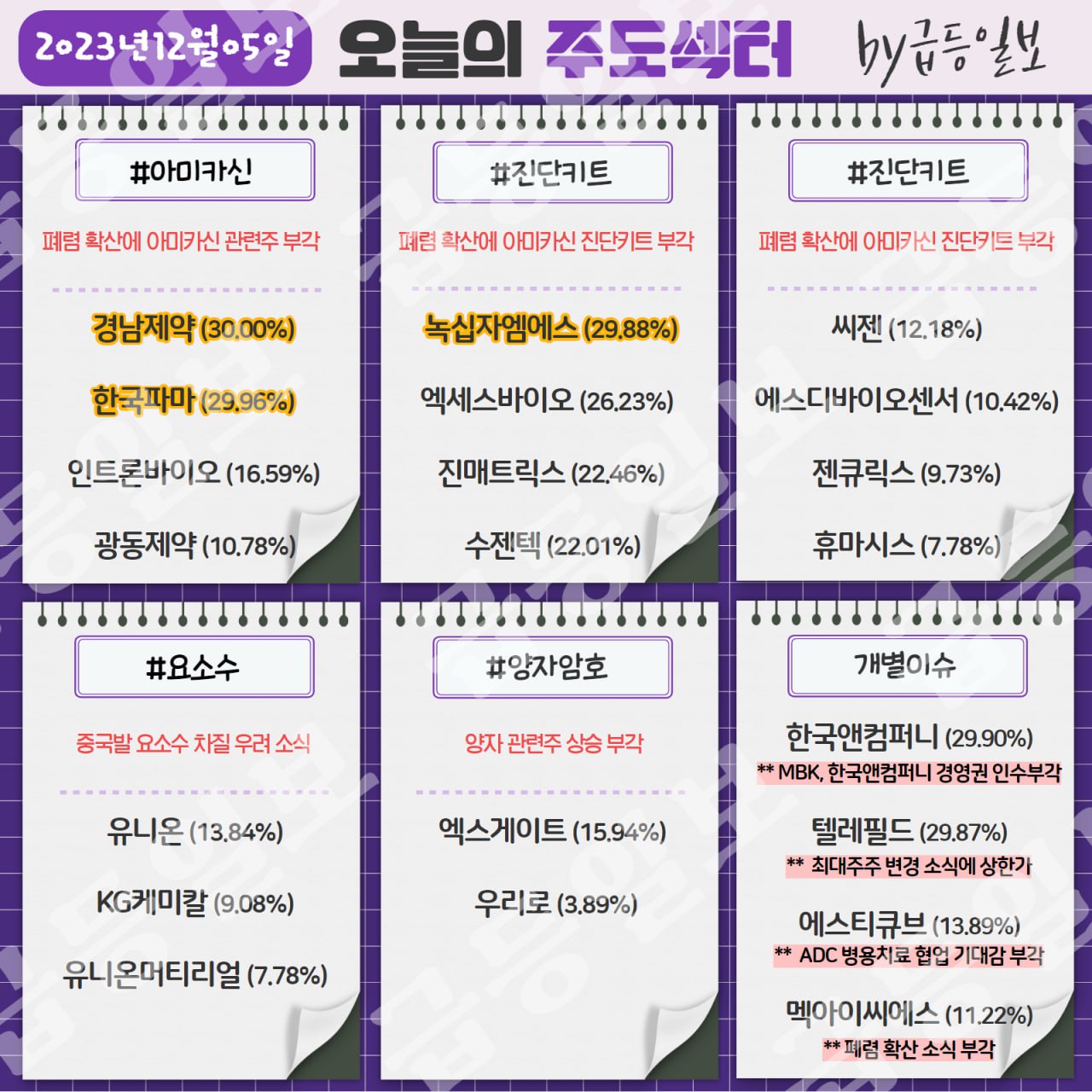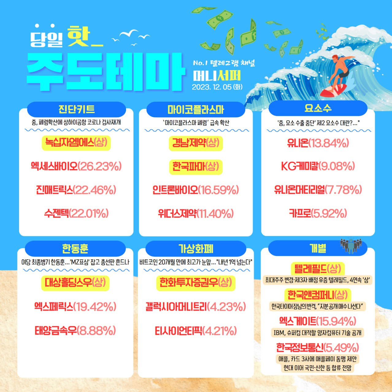 ★한국증시 주도 테마 2023년 12월 4일★ 마이코플라스마 STO 2차전지 가상화폐 수젠텍 갤럭시아에스엠 케이옥션 에코프로비엠 한화투자증권우 * 코스피 전일대비 보합(양봉) 마감 * 코스닥 전일대