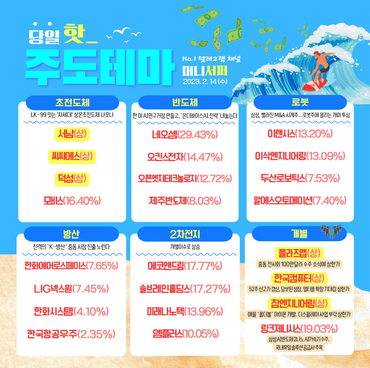 한국증시 주도 테마 ★ 초전도체 로봇 반도체 2차전지 재건 보험 ★ 씨씨에스 삼익THK 가온칩스