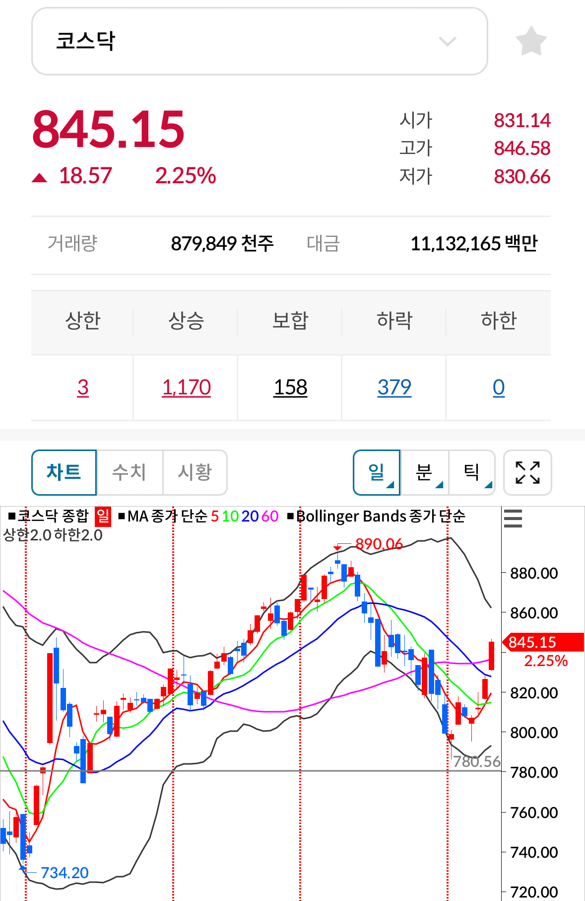 * 코스닥 전일대비 상승(양봉) 마감