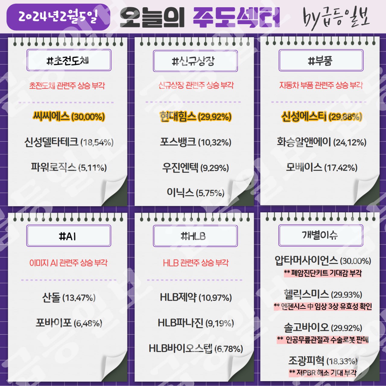 ★한국증시 주도 테마 2024년 2월 2일★ 메타 초전도체 자동차부품 HLB그룹 플레이디 씨씨에스 서연이화 HLB테라퓨틱스 * 코스피 전일대비 상승(양봉) 마감 * 코스닥 전일대비 상승(양봉) 마감 오늘