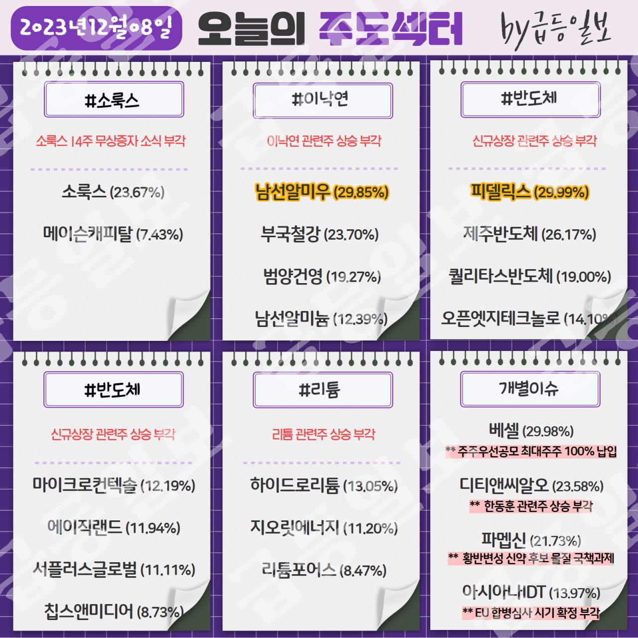 ★한국증시 주도 테마 2023년 12월 7일★ 마이코플라스마 한동훈 STO 바이오 신규상장 유유제약 그린생명과학 파멥신 와이바이오로직스 * 코스피 전일대비 하락(음봉) 마감 * 코스닥 전일대비 하락