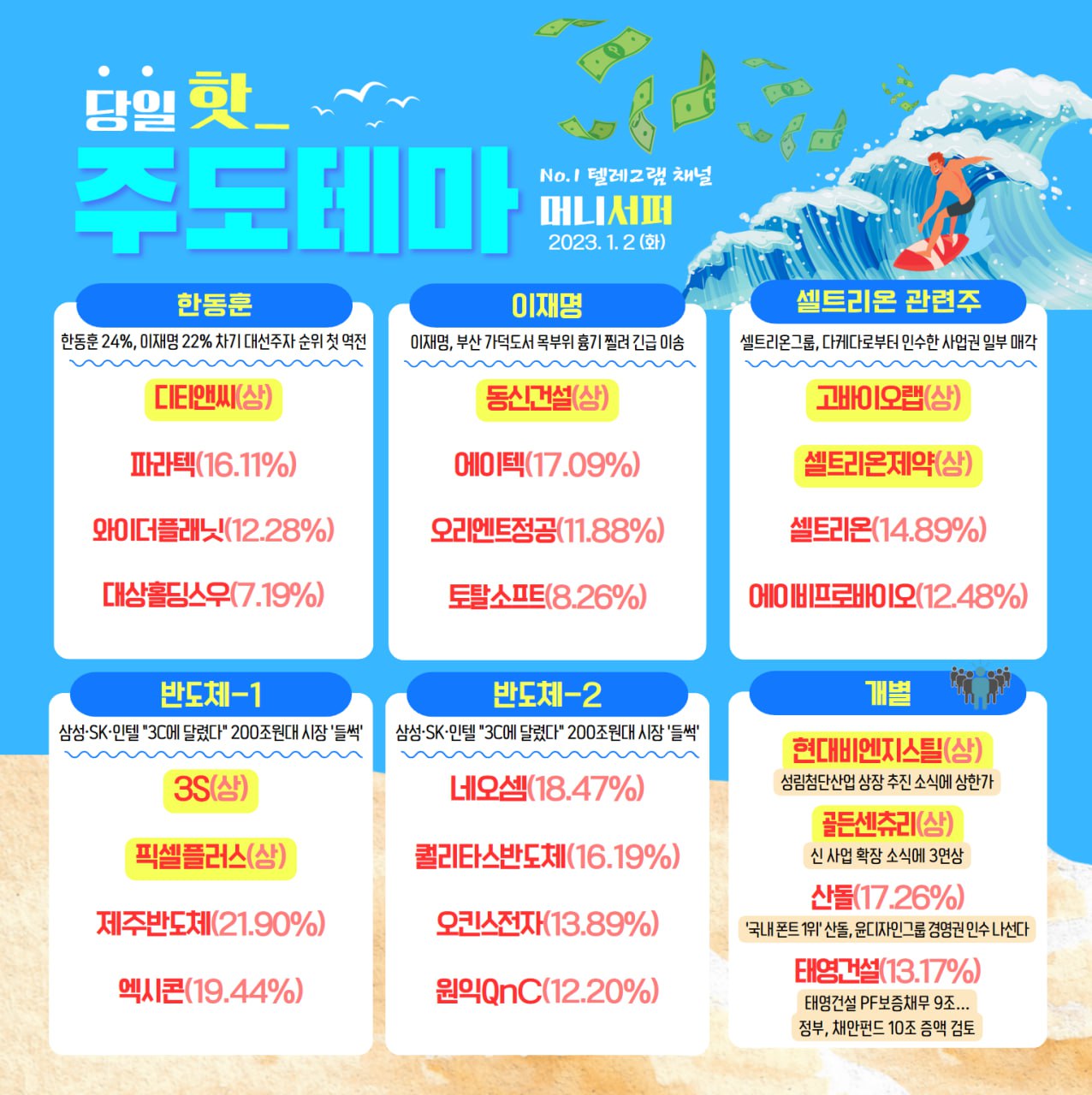 한국증시 주도 테마 ★ 한동훈 이재명 셀트리온관련 반도체 ★ 디티앤씨 동신건설 에이텍 고바이오랩 셀트리온제약 3S 픽셀플러스 제주반도체
