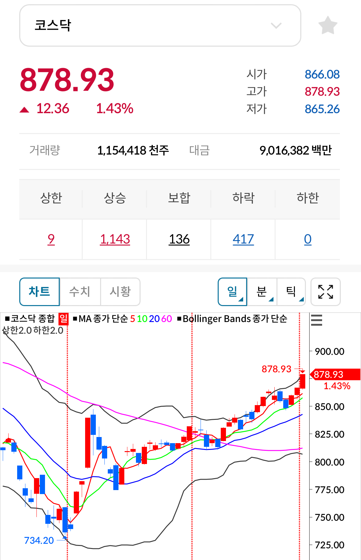 * 코스닥 전일대비 상승(양봉) 마감