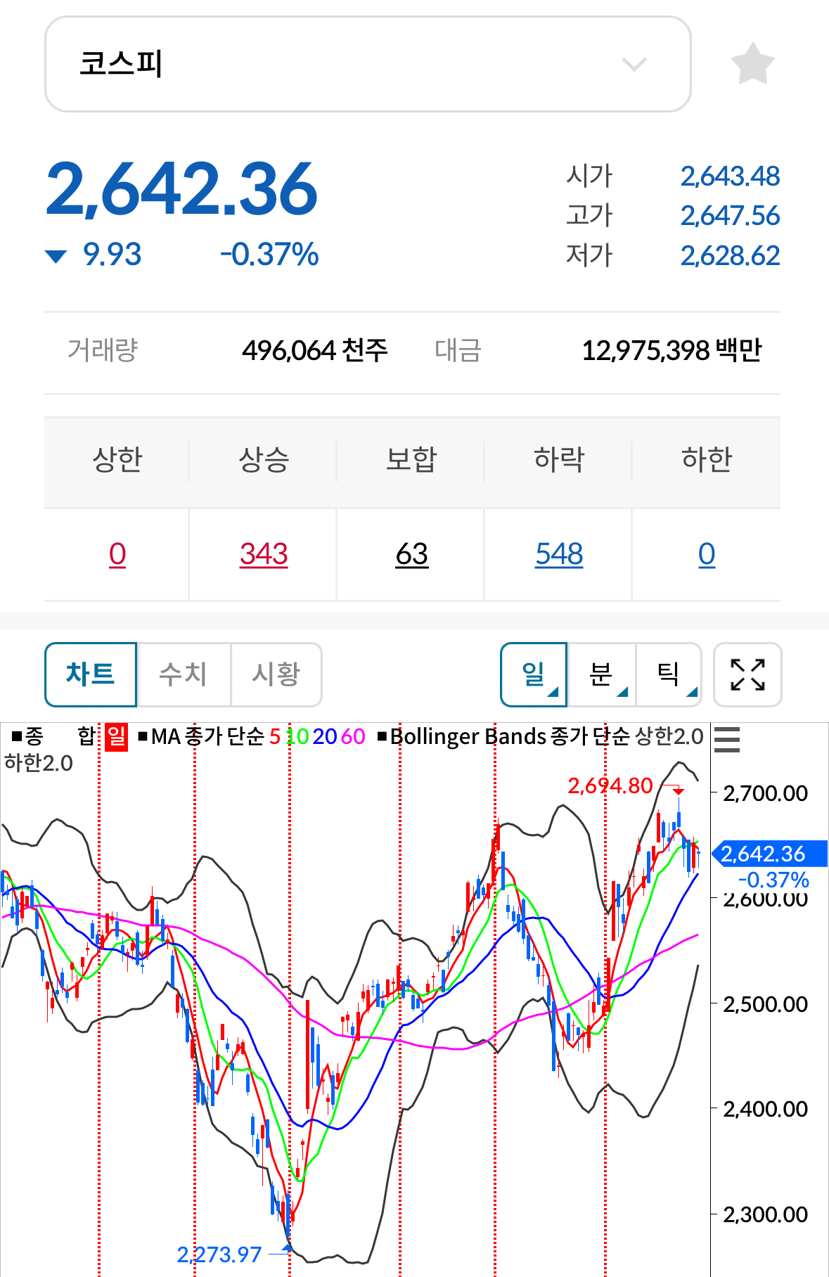 * 코스피 전일대비 보합(음봉) 마감