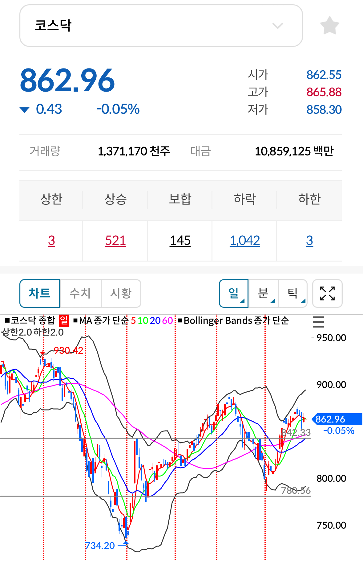 * 코스닥 전일대비 보합(음봉) 마감