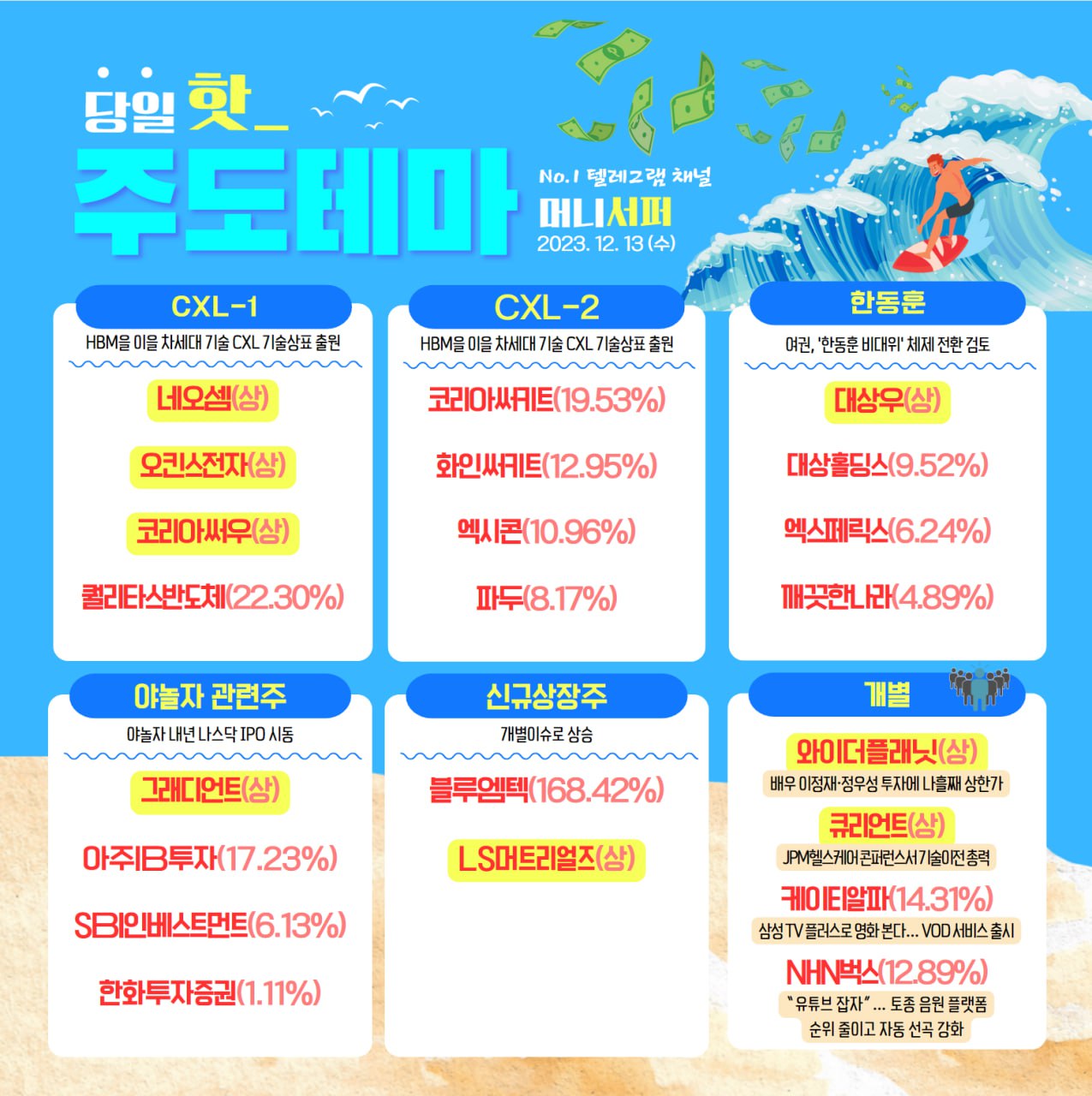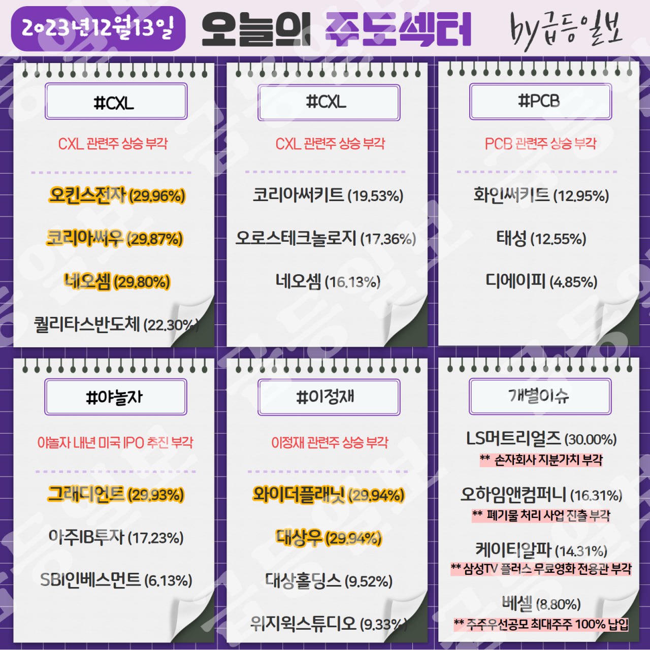 | 한국증시 주도 테마 ★ CXL(반도체), 업스테이지(AI), 의료AI ★ 오킨스전자 컴퍼니케이 스톤브잇지벤처스 코어라인소프트 (12) | 2023.12.14 |