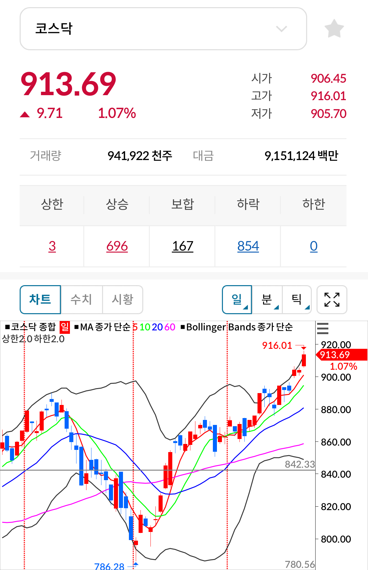* 코스닥 전일대비 상승(양봉) 마감