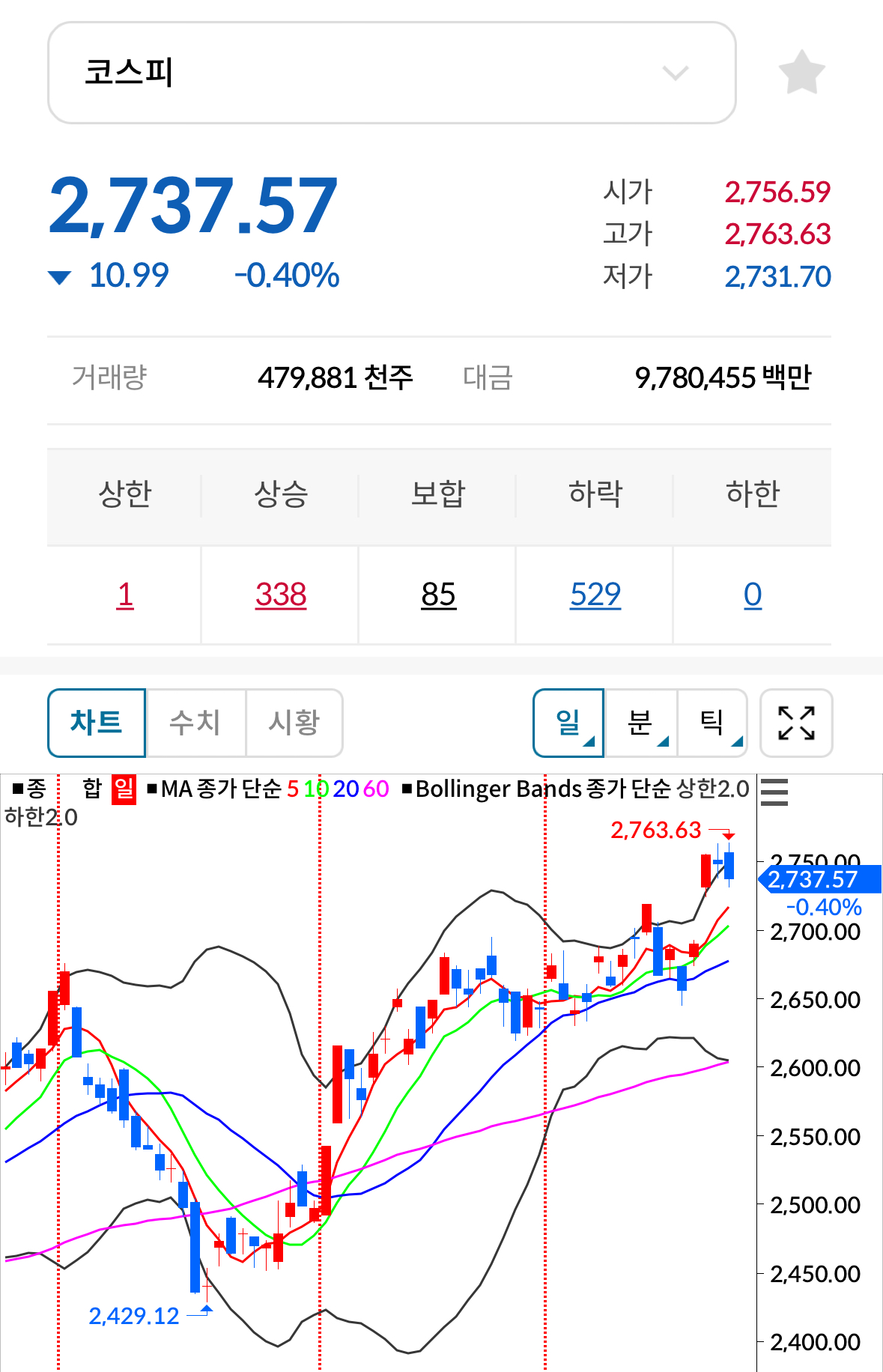 * 코스피 전일대비 하락(음봉) 마감