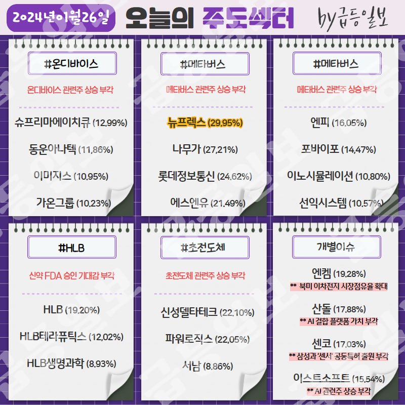 ★한국증시 주도 테마 2024년 1월 25일★ 온디바이스 반도체 AI LB그룹 코세스 아이엠티 엔텔스 LB루셈 LB세미콘 * 코스피 전일대비 상승(양봉) 마감 * 코스닥 전일대비 하락(음봉) 마감 전일 주도 테