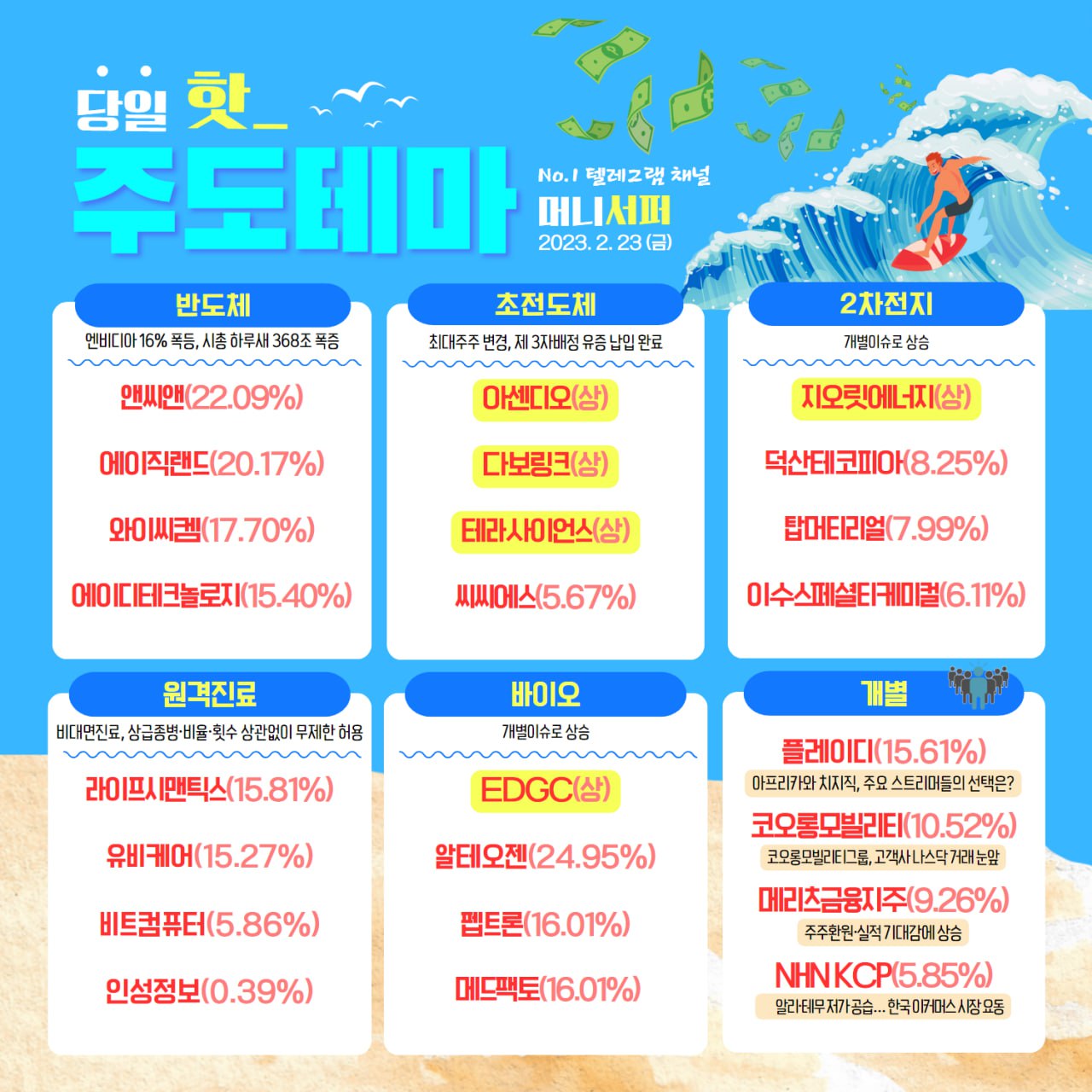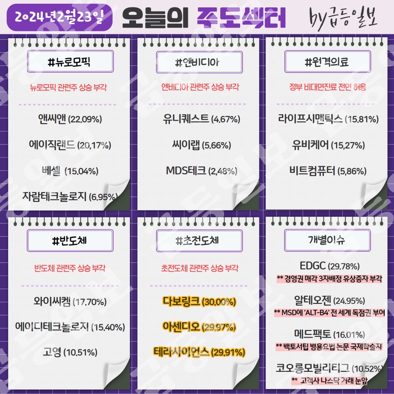 ★한국증시 주도 테마 2024년 2월 22일★ 반도체 피에스케이홀딩스 AGI칩 앤씨앤 베셀 가온칩스 2차전지 신화인터넥 초전도체 아센디오 교육 아이비김영 * 코스피 전일대비 상승(양봉) 마감 * 코스