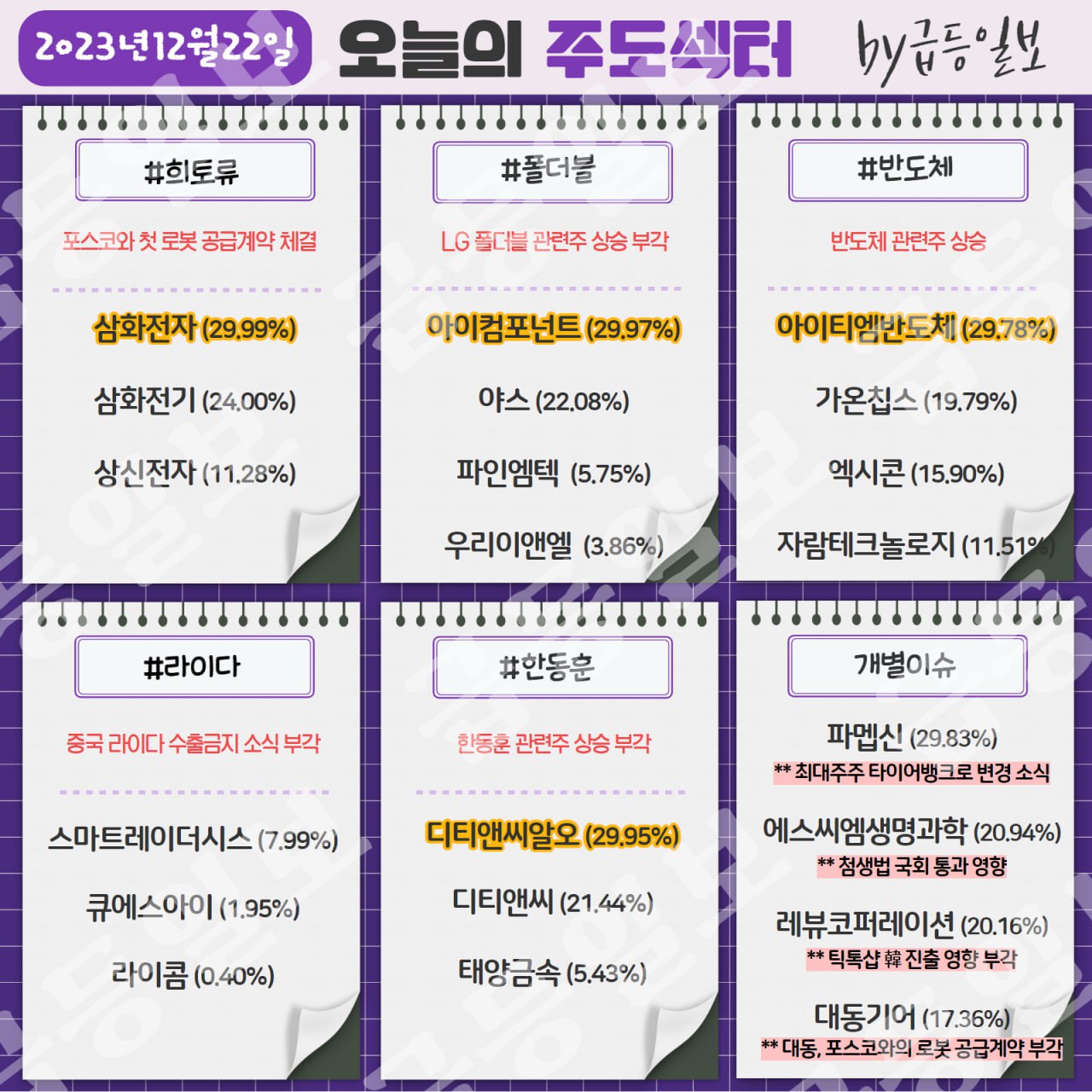 ★한국증시 주도 테마 2023년 12월 21일★ 틱톡 대동그룹 핑크퐁 위니아 모비데이즈 와이즈버즈 플레이디 이엠넷 대동 대동금속 삼성출판사 대유플러스 위니아 대유에이텍 * 코스피 전일대비 하